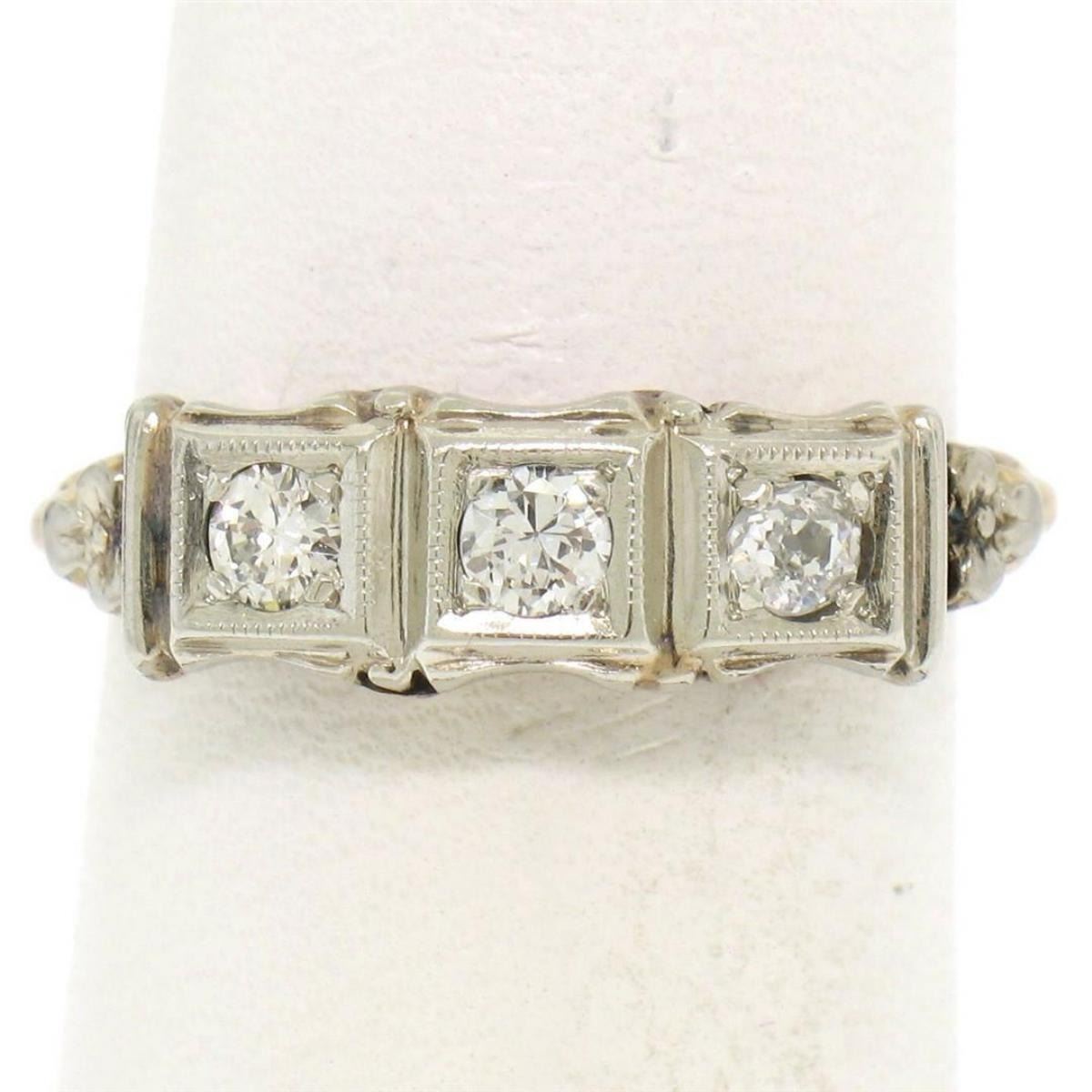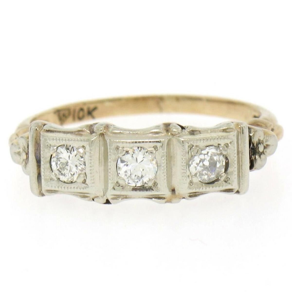 One Antique 10k Two Tone Gold 0.25ctw F VS Diamond Open Filigree Milgrain Work Band Ring. Item Details: Material:  10K Solid Yellow and White Gold, Weight:  1.8 Grams, Stone(s):  (1) Natural Genuine Diamond - Old European Cut - Bead Set - G Color - VS2 Clarity, (2) Natural Genuine Diamonds - Transitional Cut - Bead Set - F Color - VS1 Clarity, Total Carat Weight:  0.25 (approx.), Ring Size:  6.0 (We can custom size this ring.), Ring Width:  5.80mm, Ring Height:  4.61mm rise off the finger Condition:  Vintage ring w/ patina. Excellent condition!