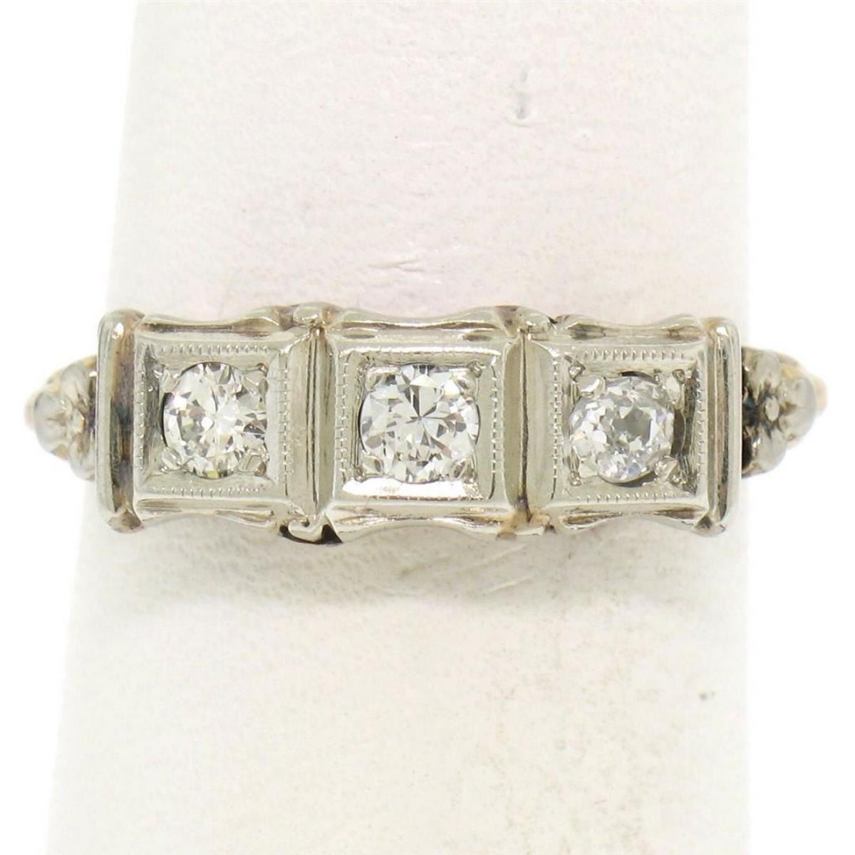 One Antique 10k Two Tone Gold 0.25ctw F VS Diamond Open Filigree Milgrain Work Band Ring. Item Details: Material: 10K Solid Yellow and White Gold, Weight: 1.8 Grams, Stone(s): (1) Natural Genuine Diamond - Old European Cut - Bead Set - G Color - VS2 Clarity, (2) Natural Genuine Diamonds - Transitional Cut - Bead Set - F Color - VS1 Clarity, Total Carat Weight: 0.25 (approx.), Ring Size: 6.0 (We can custom size this ring.), Ring Width: 5.80mm, Ring Height: 4.61mm rise off the finger Condition: Vintage ring w/ patina. Excellent condition!