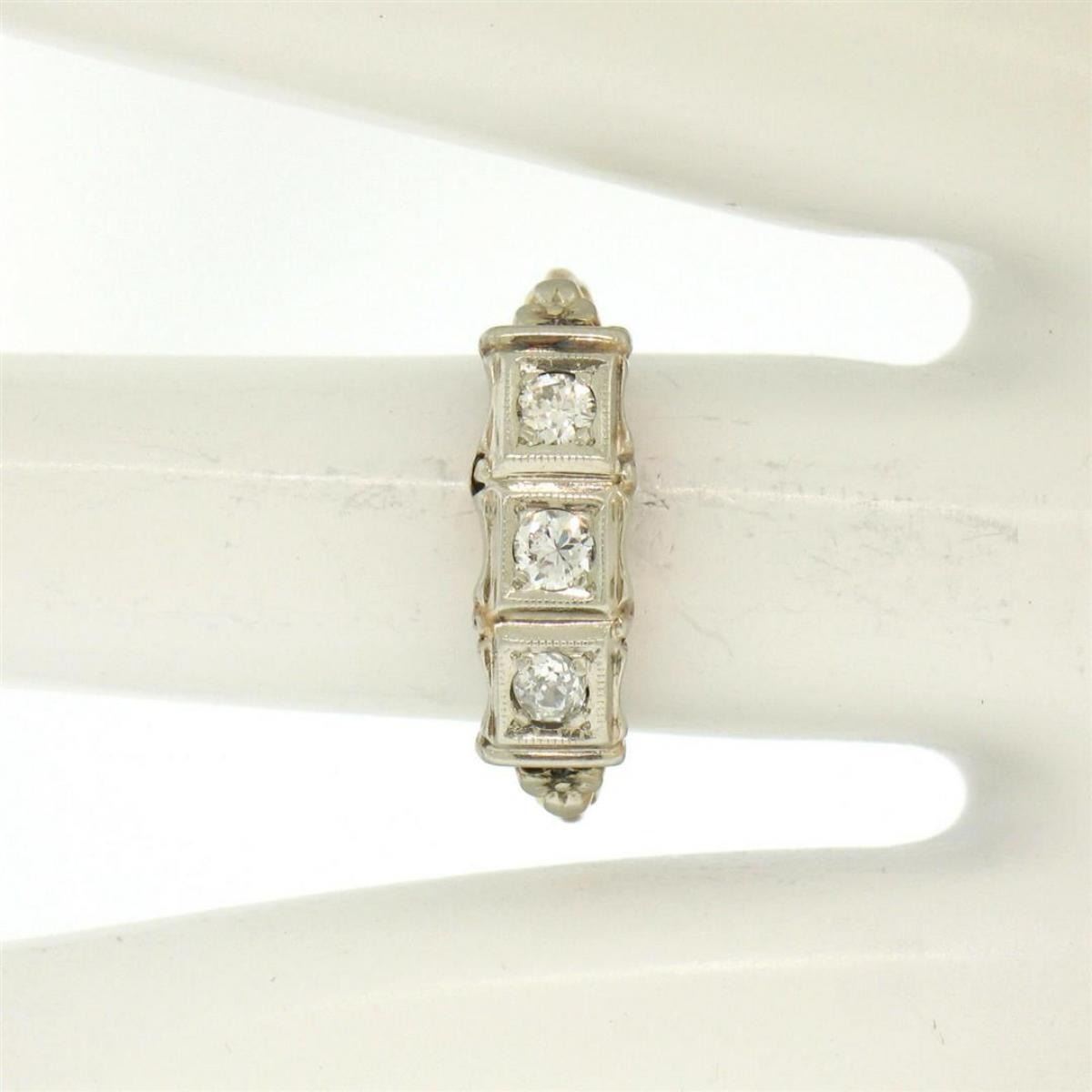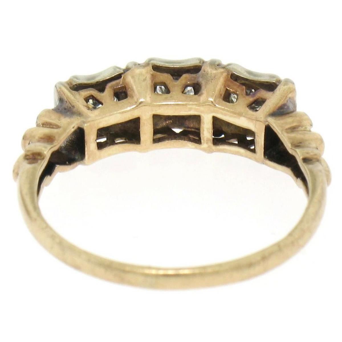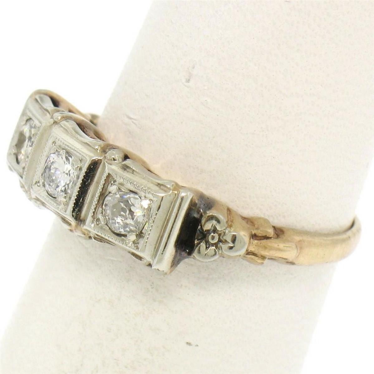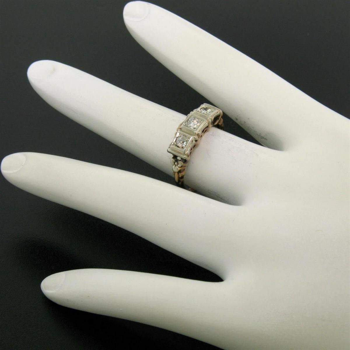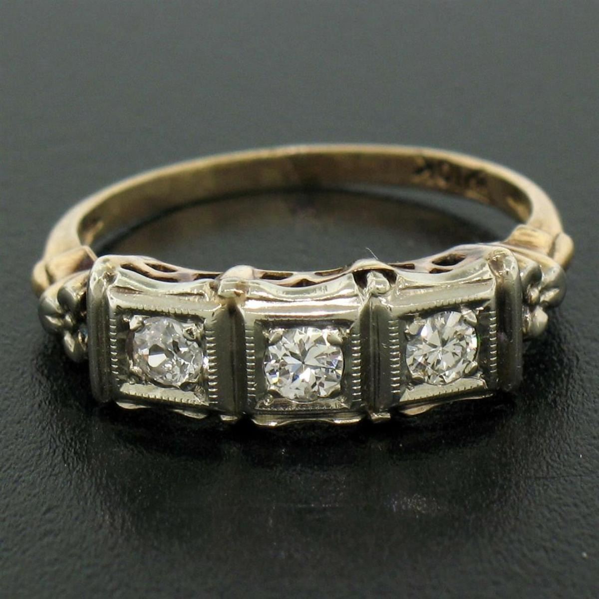 One Antique 10k Two Tone Gold 0.25ctw F VS Diamond Open Filigree Milgrain Work Band Ring. Item Details: Material: 10K Solid Yellow and White Gold, Weight: 1.8 Grams, Stone(s): (1) Natural Genuine Diamond - Old European Cut - Bead Set - G Color - VS2 Clarity, (2) Natural Genuine Diamonds - Transitional Cut - Bead Set - F Color - VS1 Clarity, Total Carat Weight: 0.25 (approx.), Ring Size: 6.0 (We can custom size this ring.), Ring Width: 5.80mm, Ring Height: 4.61mm rise off the finger Condition: Vintage ring w/ patina. Excellent condition!