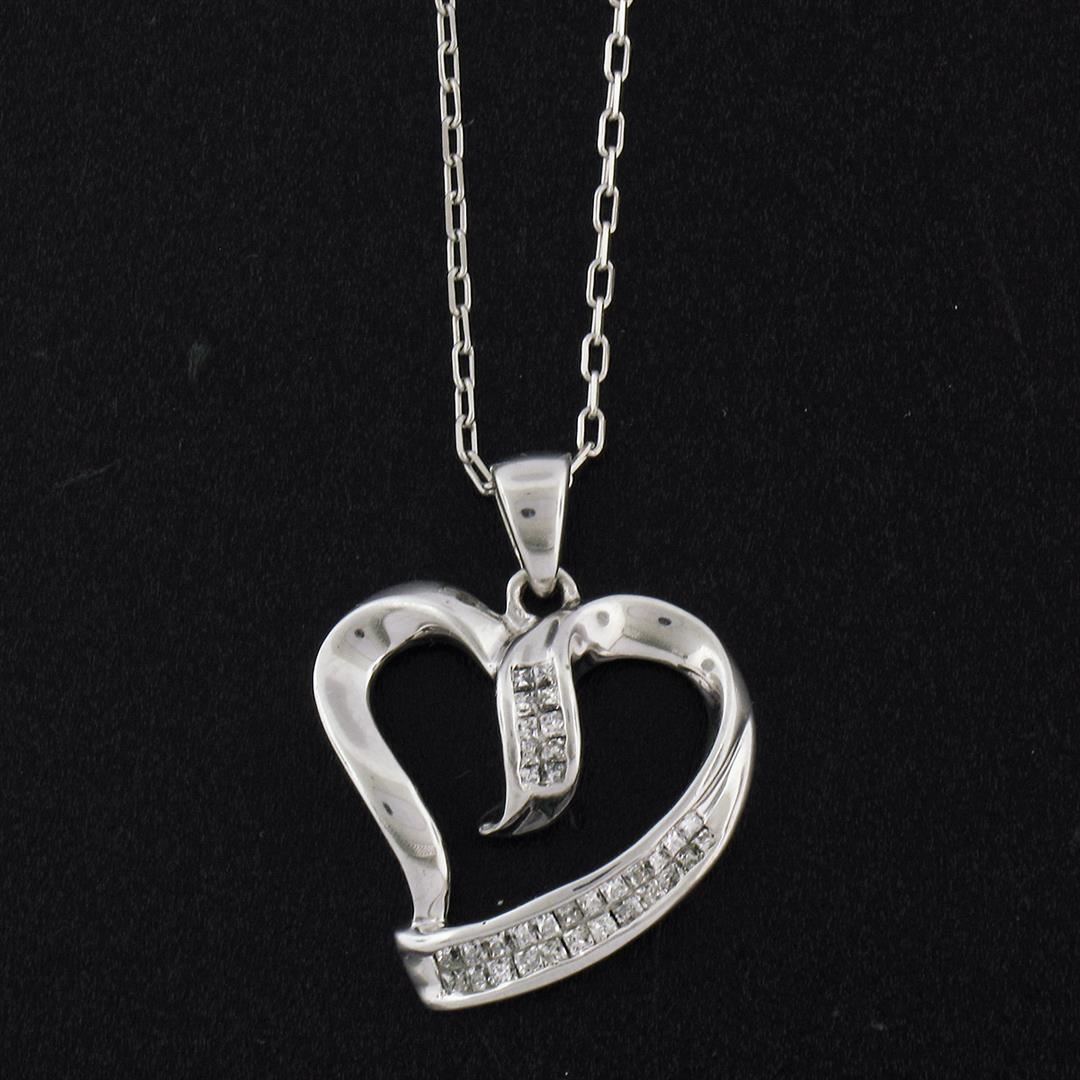 10k White Gold 0.25 ctw Dual Channel Princess Cut Diamond Open Heart Pendant Nec