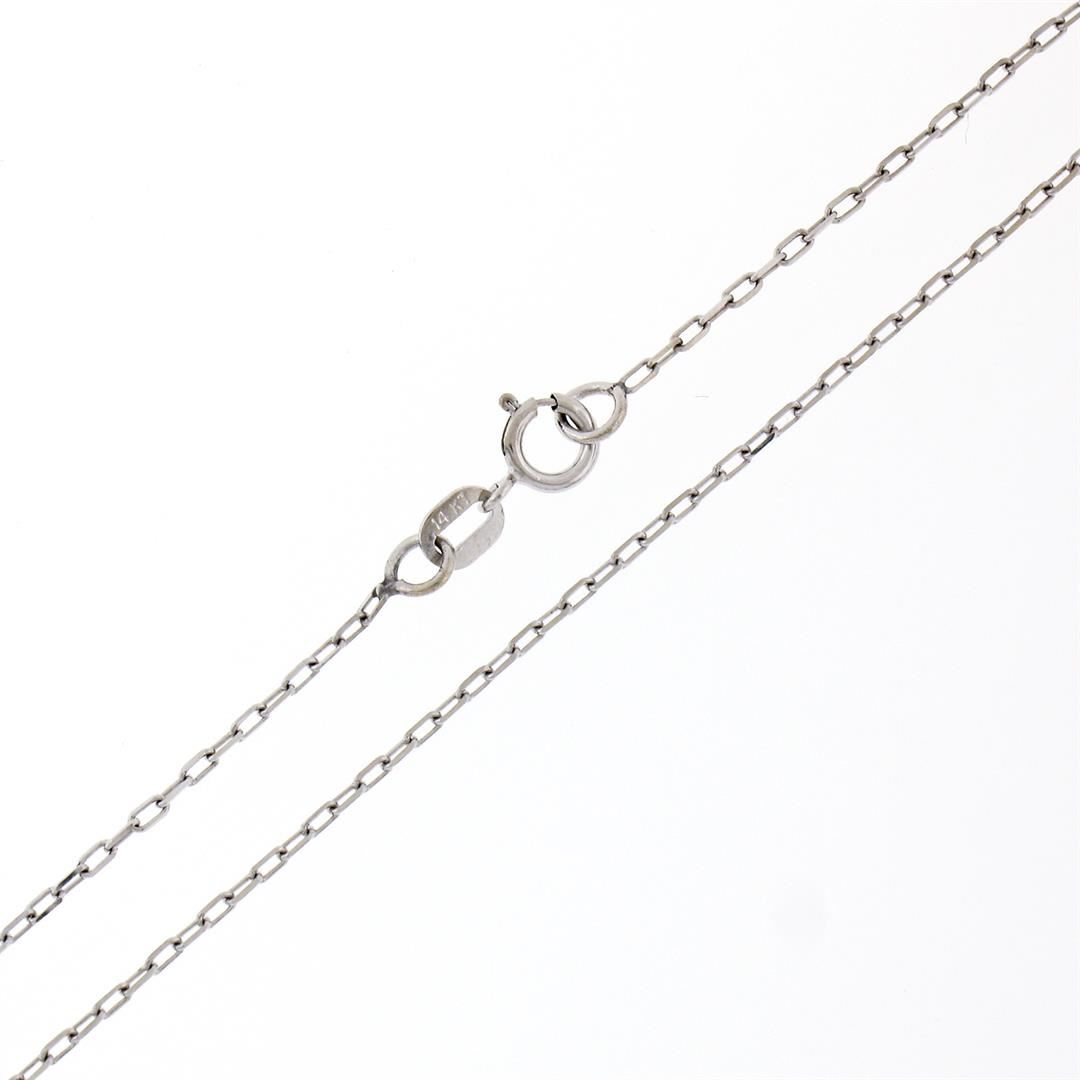 A 10k white gold open heart pendant featuring 34 channel set square princess cut diamonds (G/H - VS2/SI1; 0.25ctw). 16 inch 14k white gold cable link chain, 3.00 grams total weight, pendant measures 22.00x17.45mm.