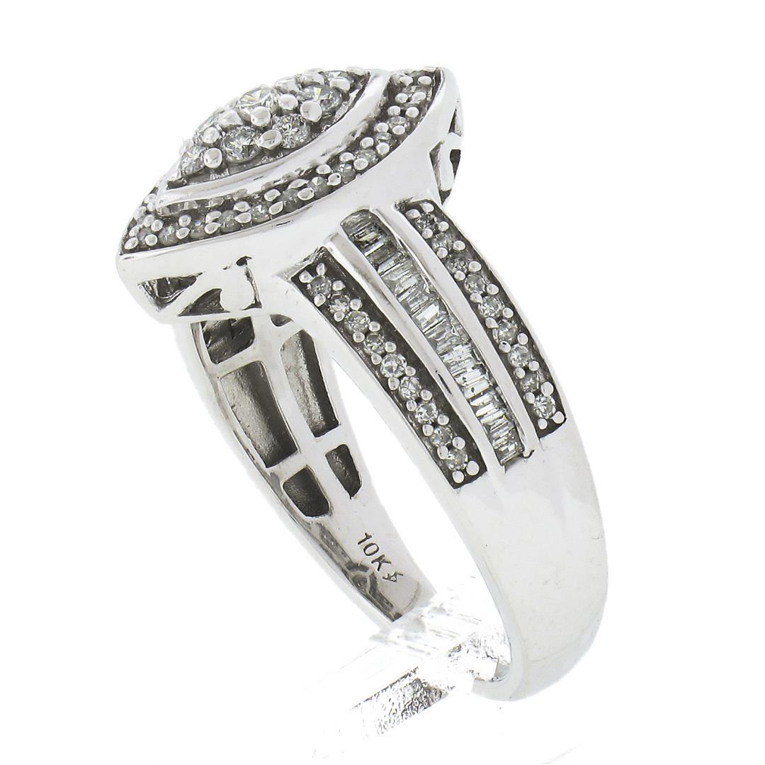 A solid 10k white gold ring, with 71 round brilliant cut natural diamonds (H/I - SI2-I2 ; 0.34ctw), and 22 baguette cut natural diamonds (H/I - SI2-I2 ; 0.44ctw). The ring is size 6.5, weighs a total of 4.10 grams, and measures 14.3mm wide.
