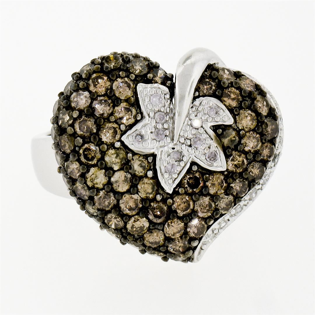 A 10k white gold leaf and heart motif ring with 2.85ctw of prong set round brilliant fancy light brown diamonds (SI2/I1) accented by an additional 0.25ctw of pave set round brilliant white diamonds (H - I1/I2). The ring is size 7.0, weighs a total of 8.28