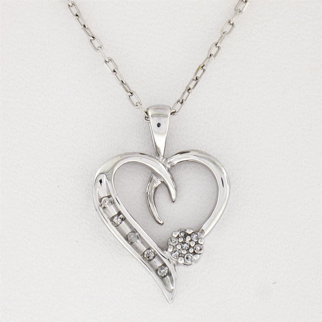 A 10k white gold open heart pendant necklace featuring 12 pave set round single cut diamonds (H/I - SI2/I1; 0.06ctw). 16 inch 14k white gold cable link chain, 2.07 grams total weight, pendant measures 20.5x14.0mm.