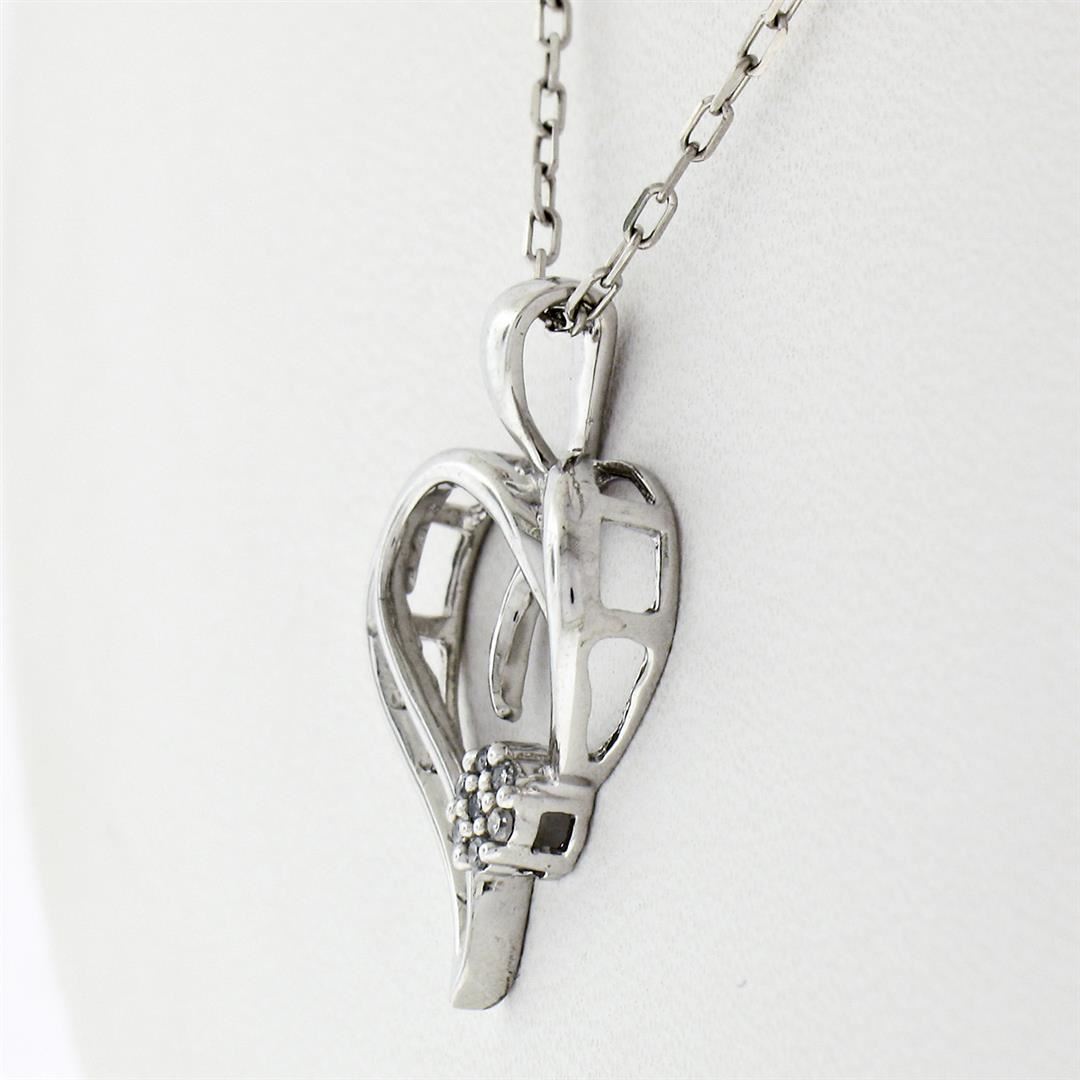 A 10k white gold open heart pendant necklace featuring 12 pave set round single cut diamonds (H/I - SI2/I1; 0.06ctw). 16 inch 14k white gold cable link chain, 2.07 grams total weight, pendant measures 20.5x14.0mm.
