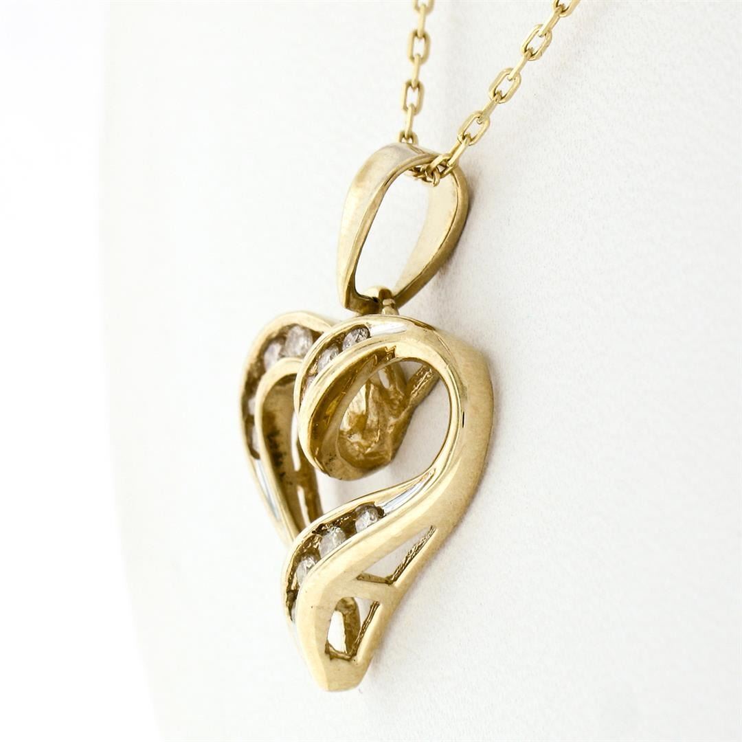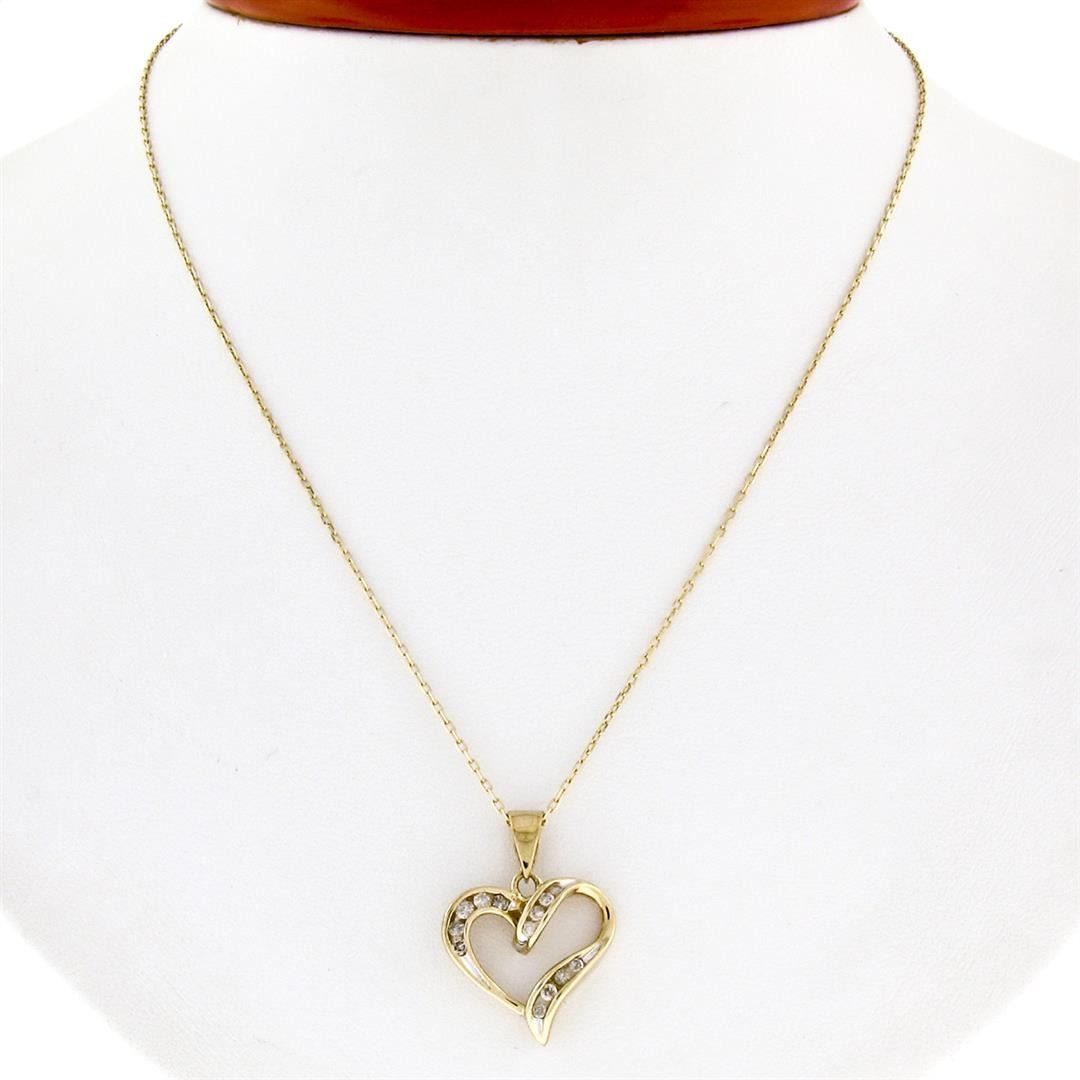 A 10k yellow gold open heart pendant necklace featuring 13 channel set round brilliant diamonds (I - I1/I2; 0.26ctw). 16 inch 14k yellow gold cable link chain, 3.75 grams total weight, pendant measures 17.8x17.8mm.