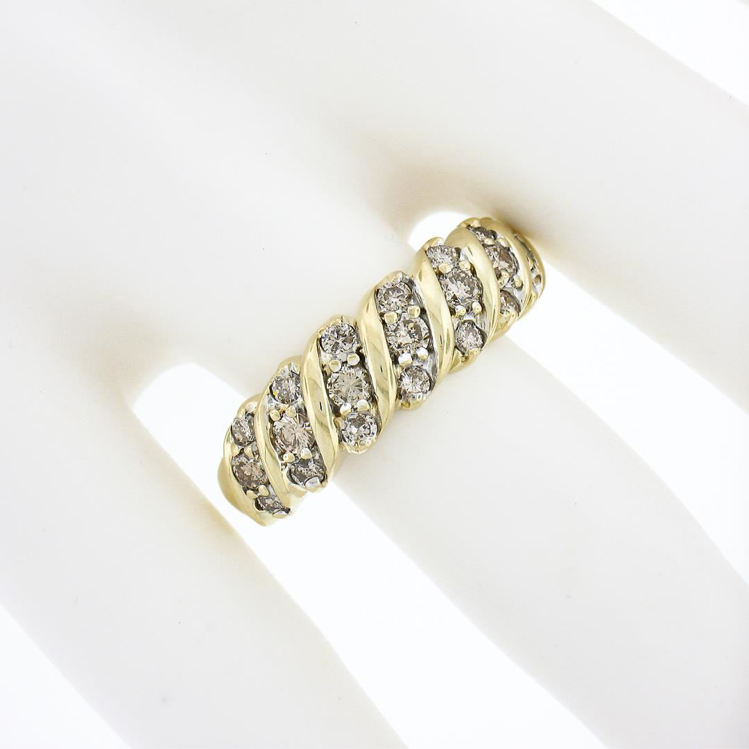 A solid 10k yellow gold scalloped band ring, with 21 round brilliant cut natural diamonds (SI1/SI2 ; Fancy Light Champagne Color - 0.84ctw). The ring is size 9.5, weighs a total of 4.85 grams, and measures 7.50mm wide.