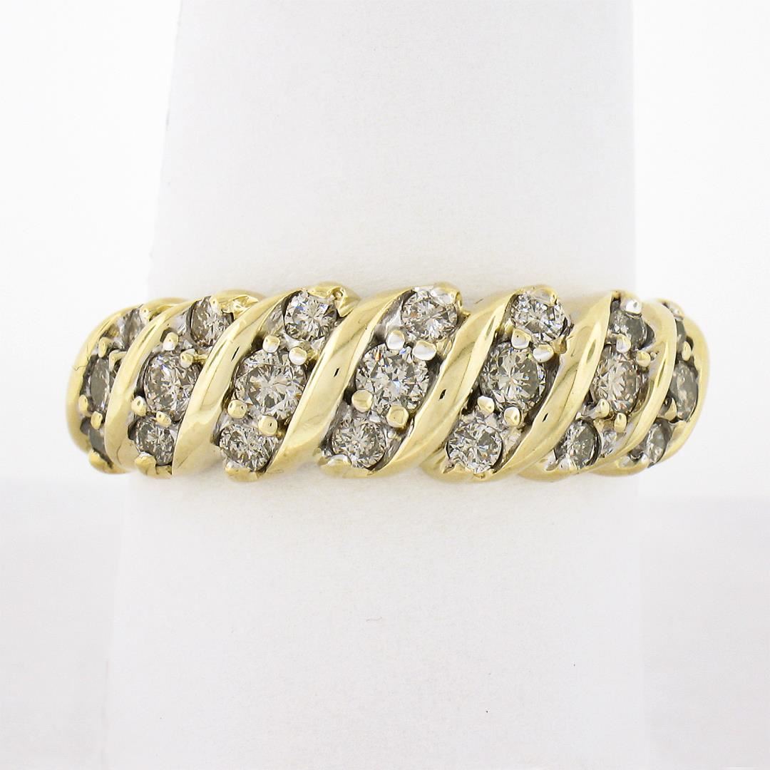 A solid 10k yellow gold scalloped band ring, with 21 round brilliant cut natural diamonds (SI1/SI2 ; Fancy Light Champagne Color - 0.84ctw). The ring is size 9.5, weighs a total of 4.85 grams, and measures 7.50mm wide.