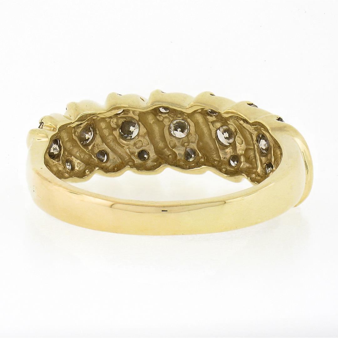 A solid 10k yellow gold scalloped band ring, with 21 round brilliant cut natural diamonds (SI1/SI2 ; Fancy Light Champagne Color - 0.84ctw). The ring is size 9.5, weighs a total of 4.85 grams, and measures 7.50mm wide.