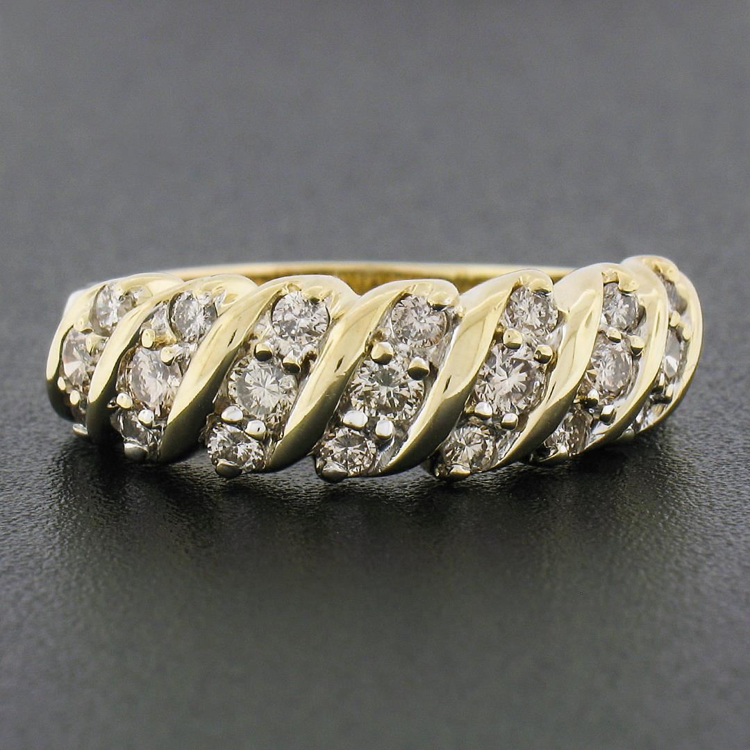 A solid 10k yellow gold scalloped band ring, with 21 round brilliant cut natural diamonds (SI1/SI2 ; Fancy Light Champagne Color - 0.84ctw). The ring is size 9.5, weighs a total of 4.85 grams, and measures 7.50mm wide.