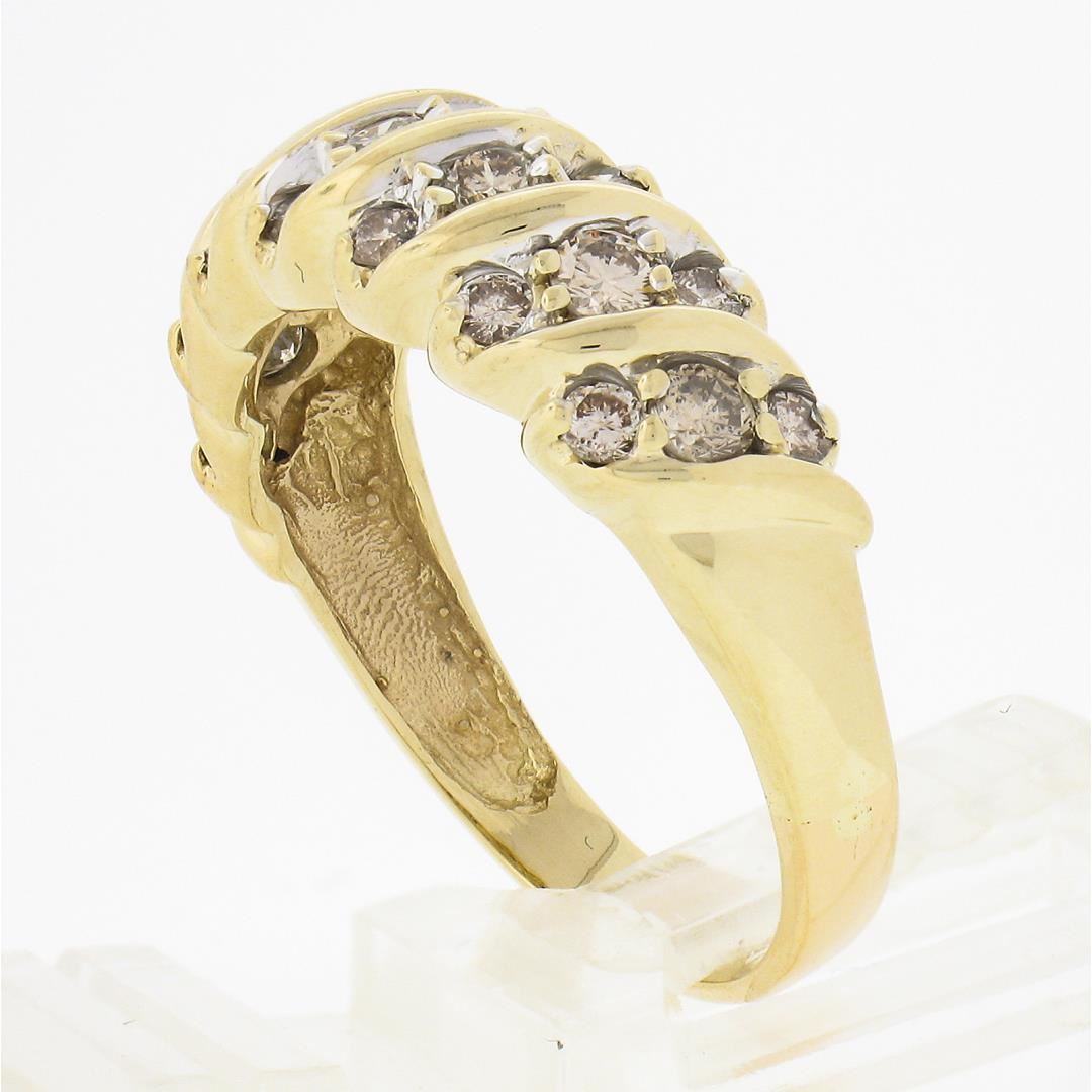 A solid 10k yellow gold scalloped band ring, with 21 round brilliant cut natural diamonds (SI1/SI2 ; Fancy Light Champagne Color - 0.84ctw). The ring is size 9.5, weighs a total of 4.85 grams, and measures 7.50mm wide.