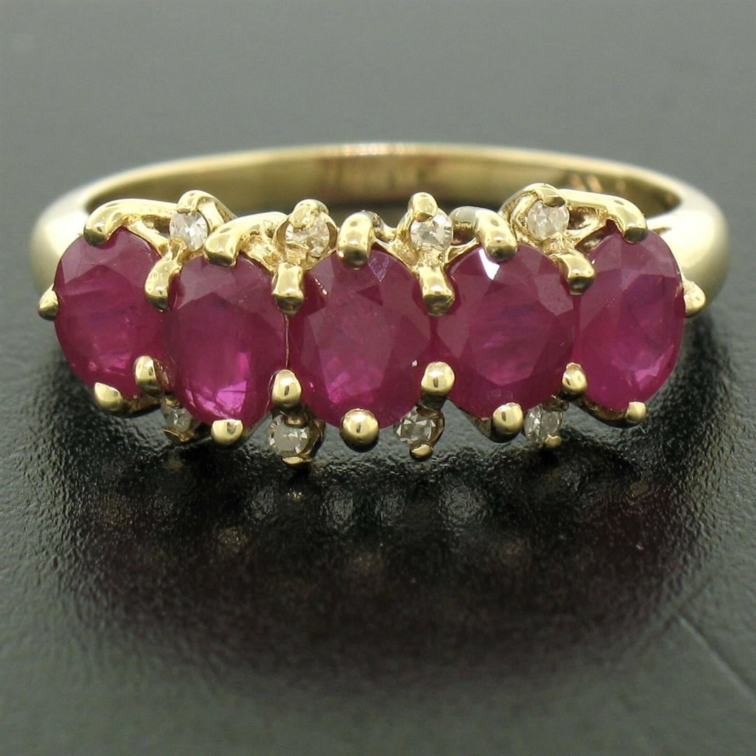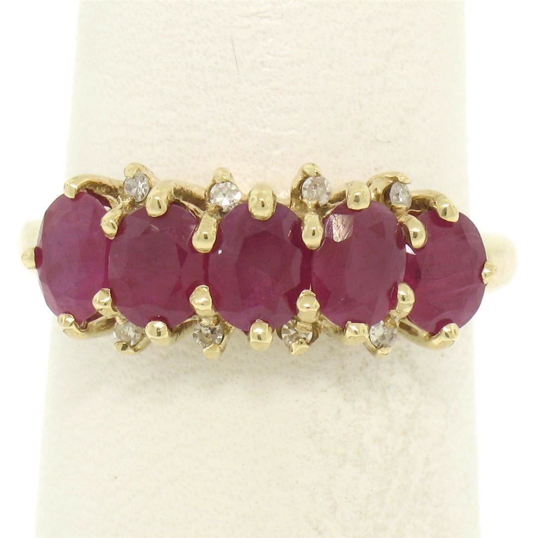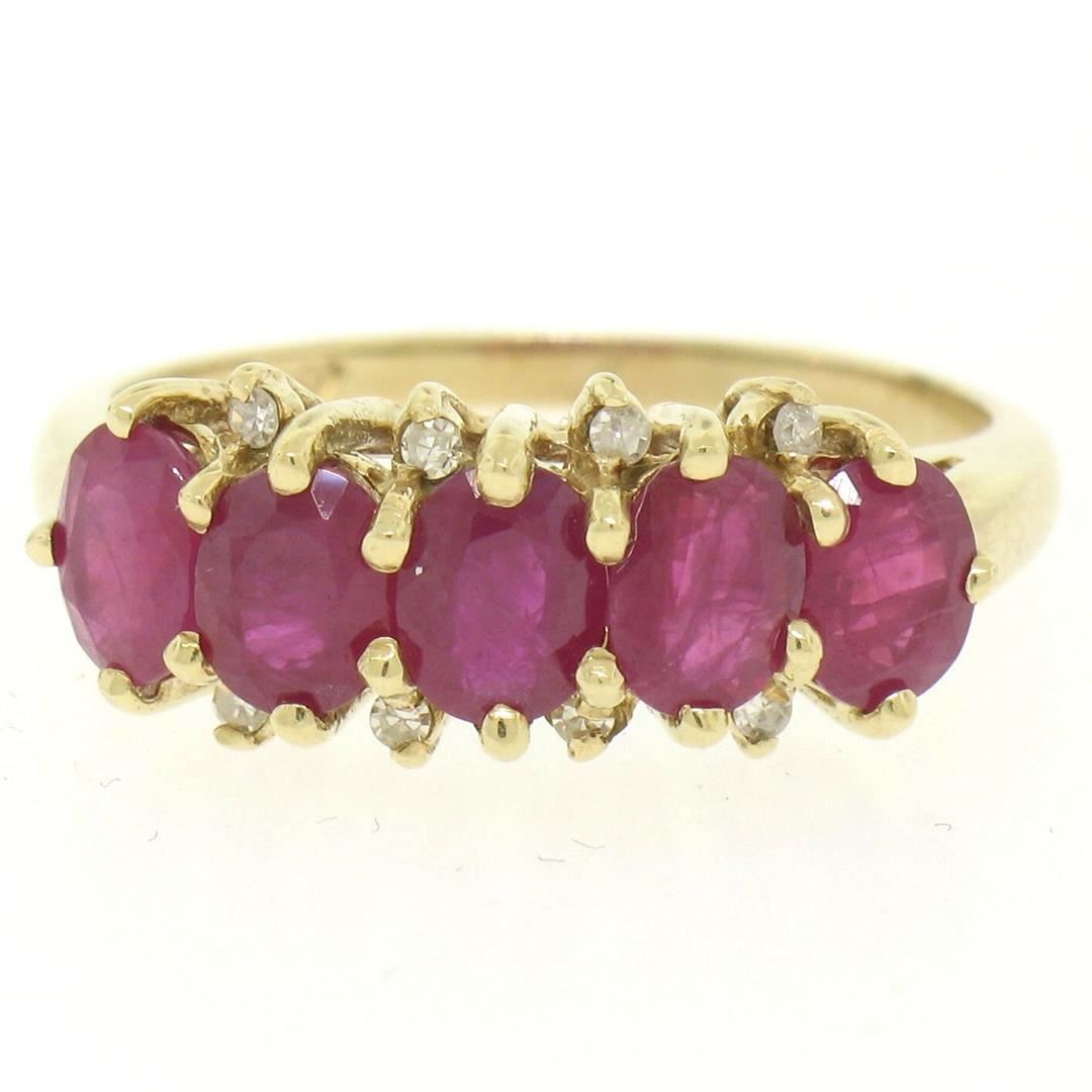 One 10k Yellow Gold 1.79ctw Shared Prong Set Oval Ruby Band Ring w/ Diamond Accents. Item Details: Material: 10k Solid Yellow Gold, Weight: 2.6 Grams, Stone(s): (5) Natural Genuine Rubies - Oval Cut - Shared Prong Set - Deep Rich Red Color - 1.75ctw (approx.), (8) Natural Genuine Diamonds - Single Cut - Prong Set - H Color - SI1 Clarity - 0.04ctw (approx.), Total Carat Weight: 1.79 (approx.), Ring Size: 7.0, Ring Width: 7.8mm, Ring Height: 5.5mm rise off the finger, Condition: Excellent condition!