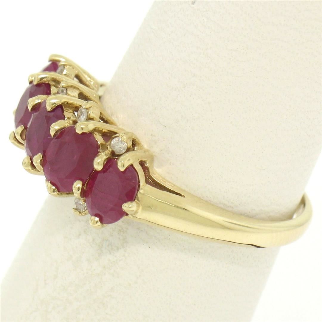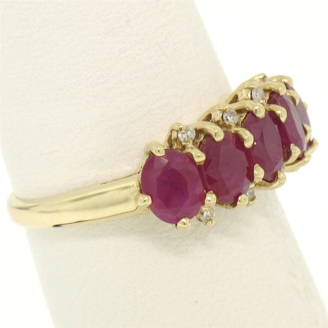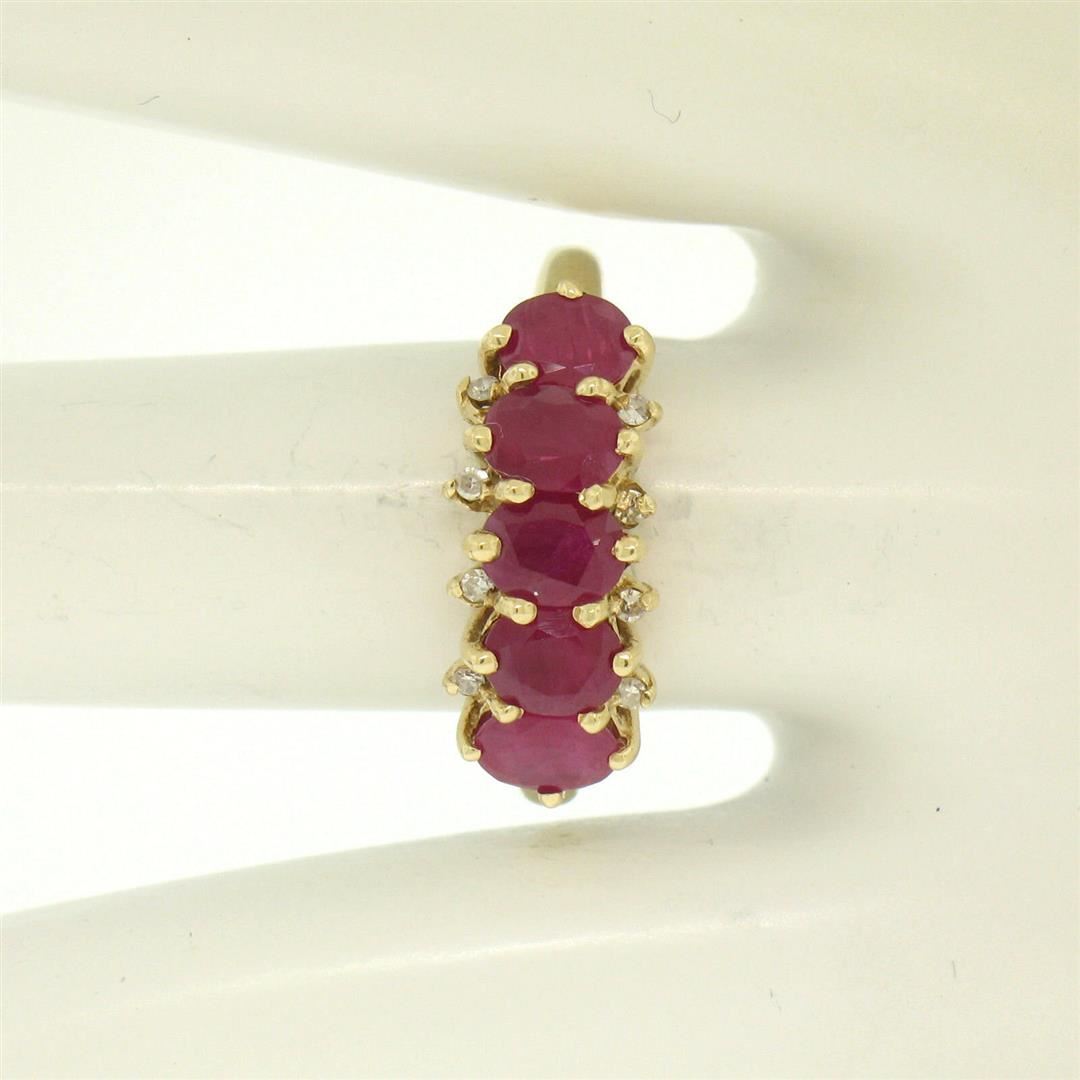 One 10k Yellow Gold 1.79ctw Shared Prong Set Oval Ruby Band Ring w/ Diamond Accents. Item Details: Material: 10k Solid Yellow Gold, Weight: 2.6 Grams, Stone(s): (5) Natural Genuine Rubies - Oval Cut - Shared Prong Set - Deep Rich Red Color - 1.75ctw (approx.), (8) Natural Genuine Diamonds - Single Cut - Prong Set - H Color - SI1 Clarity - 0.04ctw (approx.), Total Carat Weight: 1.79 (approx.), Ring Size: 7.0, Ring Width: 7.8mm, Ring Height: 5.5mm rise off the finger, Condition: Excellent condition!
