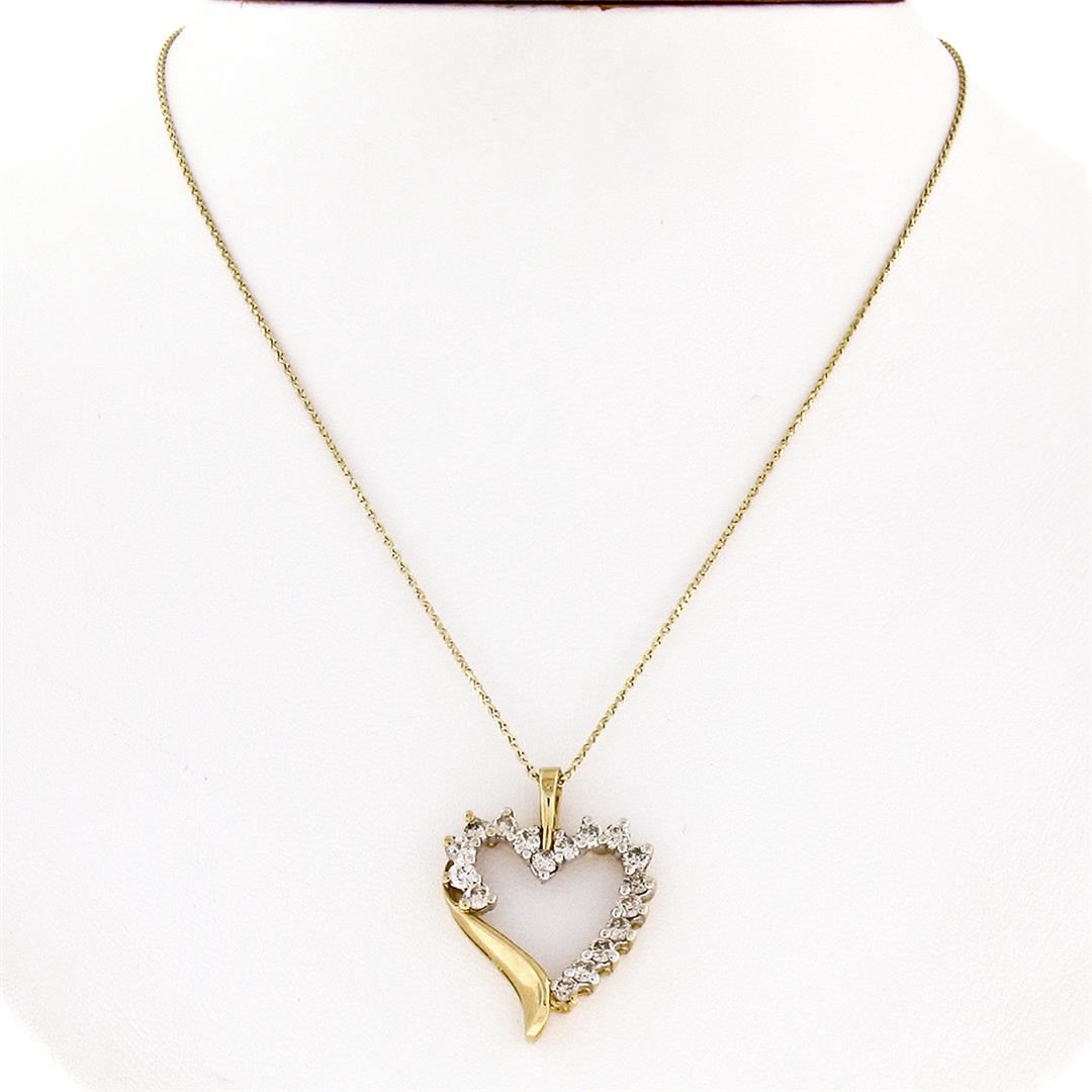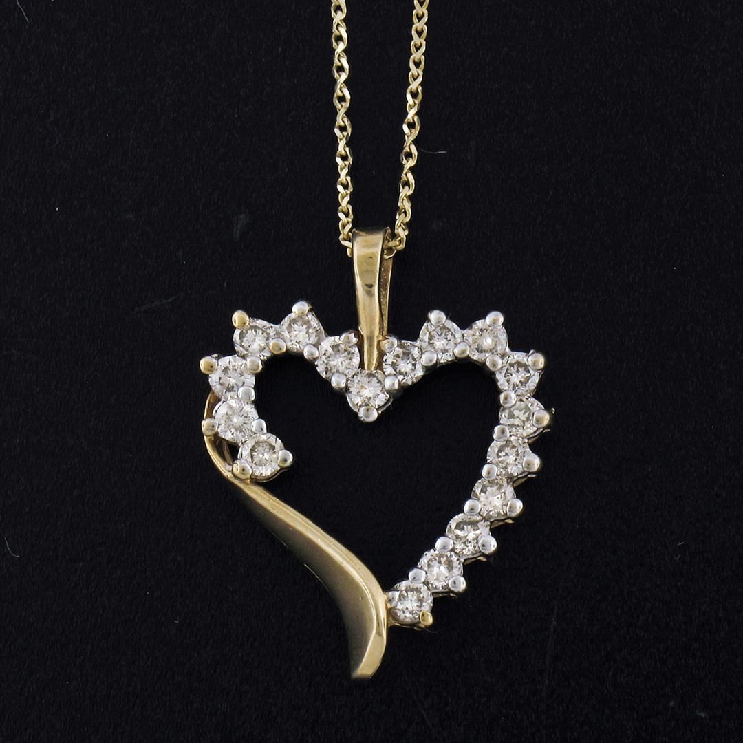 An estate solid 10k yellow gold heart pendant necklace, with 17 round brilliant cut natural diamonds (I- SI1/SI2; 0.60ctw). The pendant weighs a total of 4.08 grams, measures 25.07x19.32mm including the bail, and 14k yellow gold 16 inch cable link chain