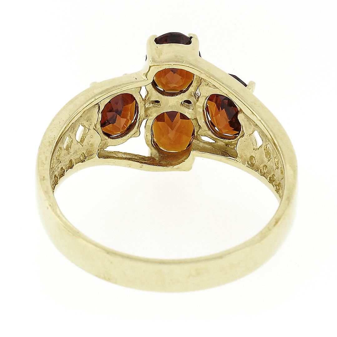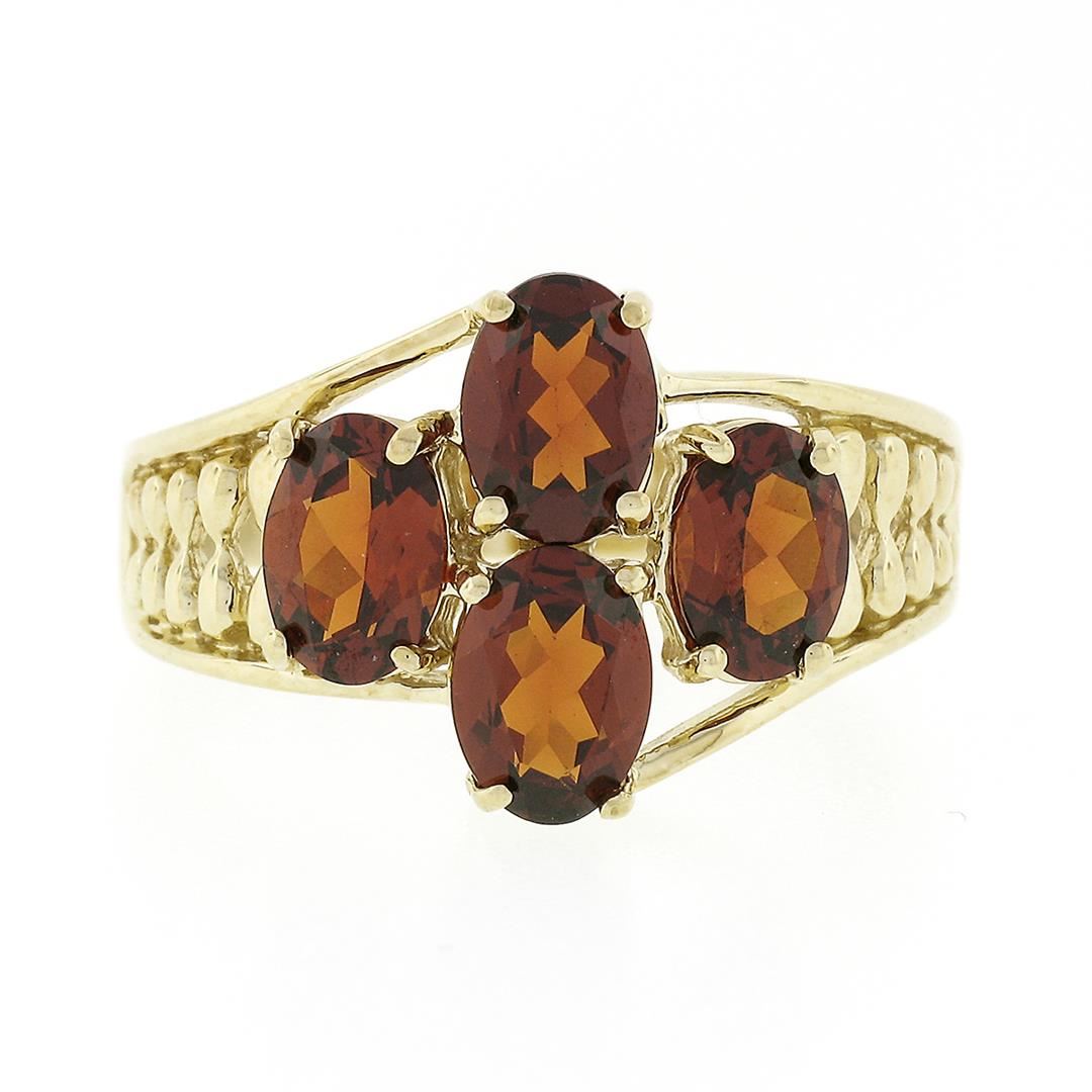 A vintgae solid 10k yellow gold wide band ring, featuring 4 oval cut natural garnets (7x5mm - 3.50ctw). The ring is size 10.0, weighs a total of 4.18 grams, and measures 14mm wide.
