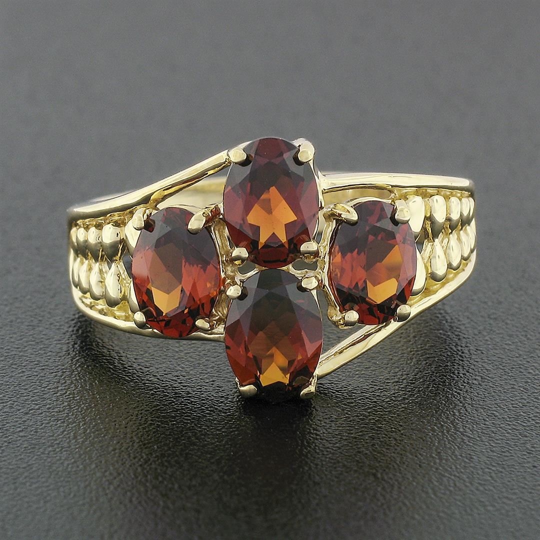 A vintgae solid 10k yellow gold wide band ring, featuring 4 oval cut natural garnets (7x5mm - 3.50ctw). The ring is size 10.0, weighs a total of 4.18 grams, and measures 14mm wide.
