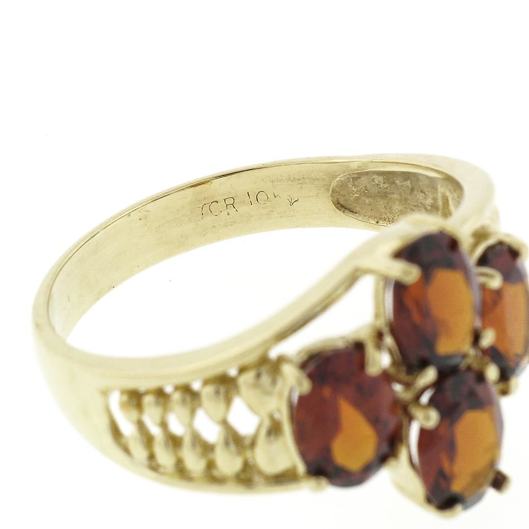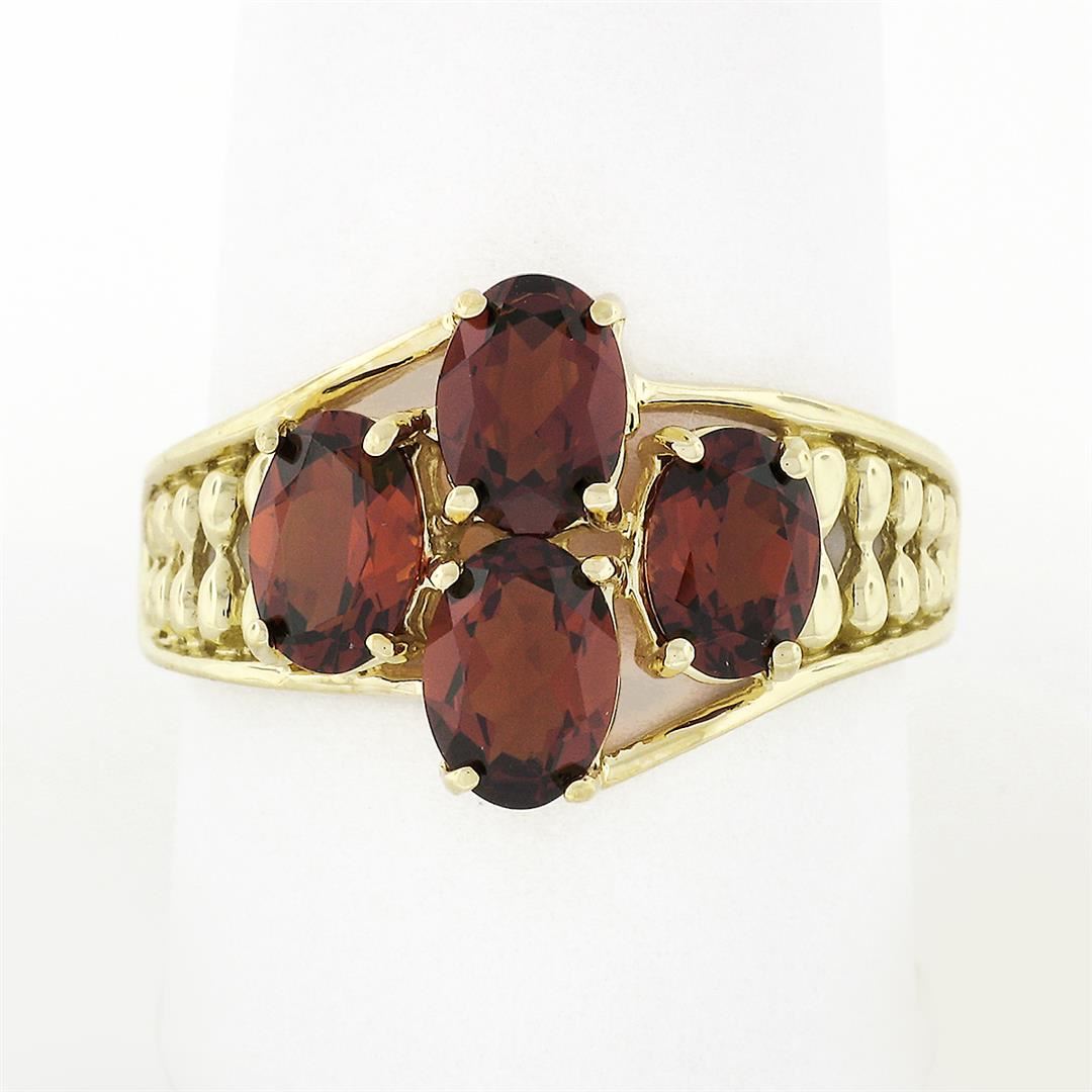 A vintgae solid 10k yellow gold wide band ring, featuring 4 oval cut natural garnets (7x5mm - 3.50ctw). The ring is size 10.0, weighs a total of 4.18 grams, and measures 14mm wide.