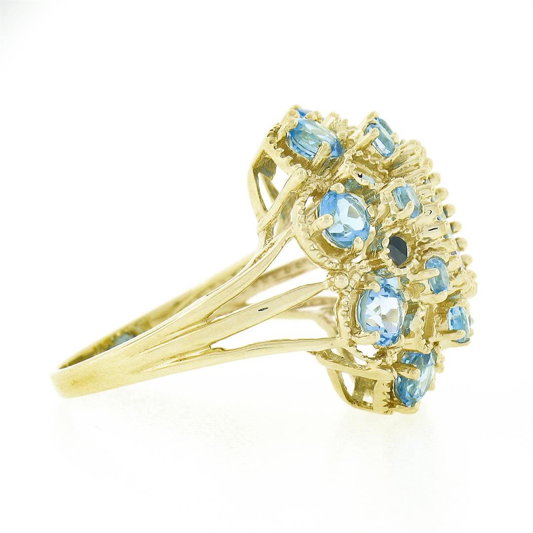 A solid 10 yellow gold tiered cluster ring, with 1 oval cut and 16 round cut blue stones.The ring is size 8.5, weighs a total of 6.36 grams, and measures 21.75mm wide.