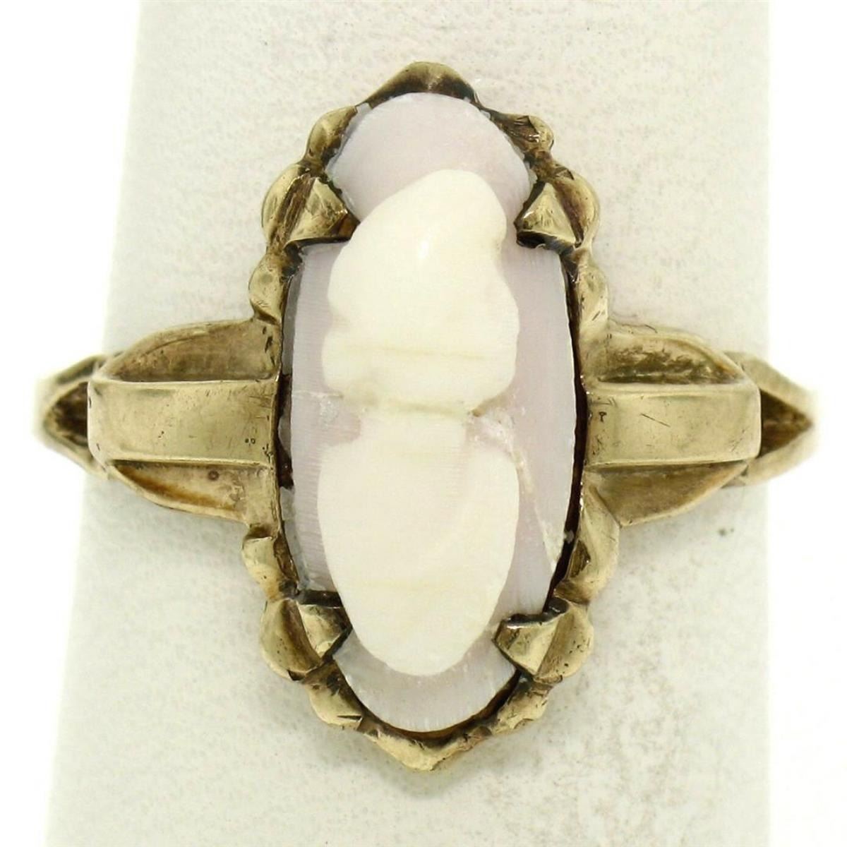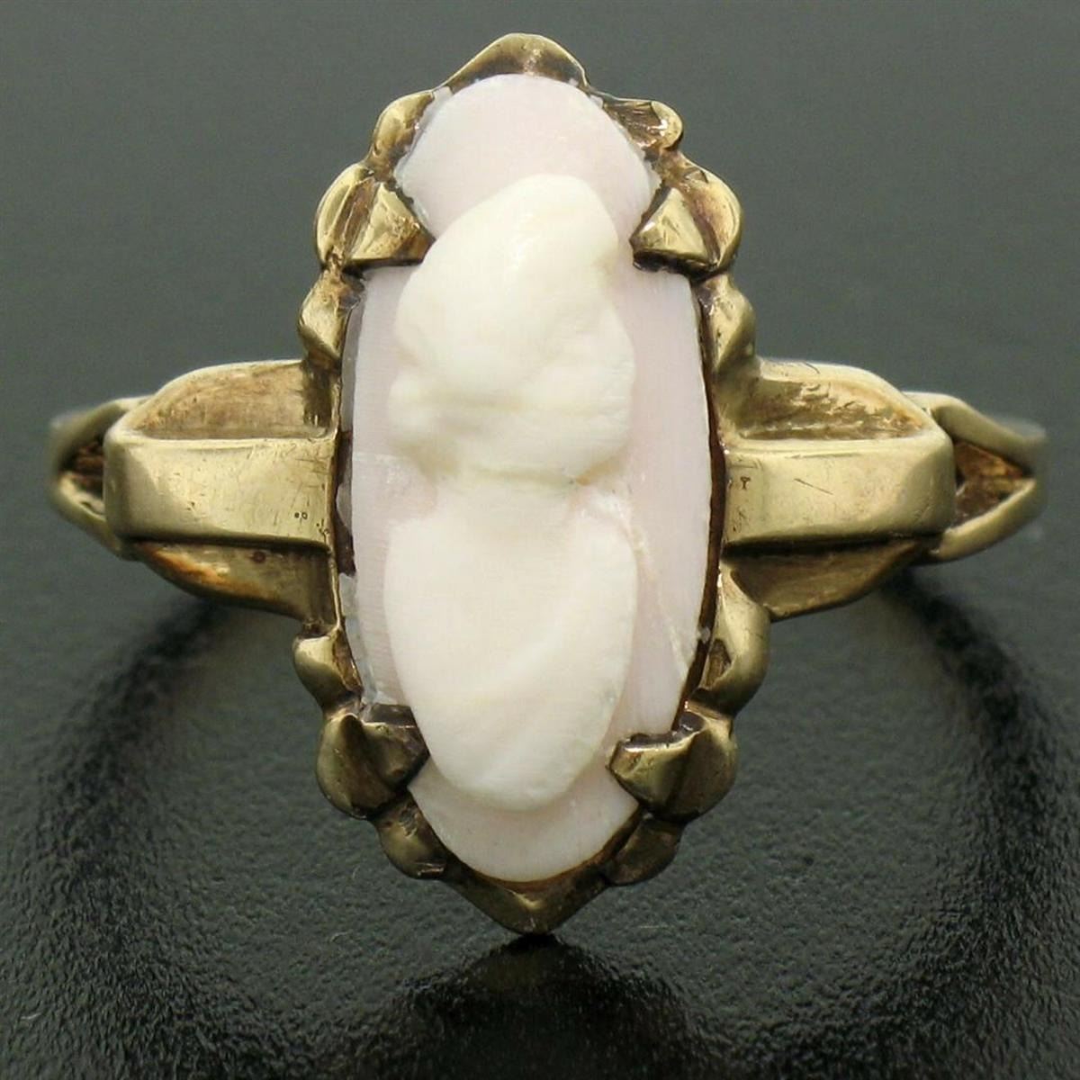 One Antique Victorian 10k Yellow Gold Simple Petite Carved Pink Stone Cameo Ring. Item Details: Material: Solid 10k Yellow Gold, Weight: 3.2 Grams, Stone(s): (1) Genuine Carved Stone Cameo - Oval Cut - Prong Set - White Carving on Pale Pink Field, Ring Size: 6.5 (We can custom size this ring.), Ring Width: 16.99mm, Ring Height: 5.84mm rise off the finger, Condition: Antique, Victorian era piece. Cameo appears to have been repaired at one point. Great overall condition and 100% ready to wear.