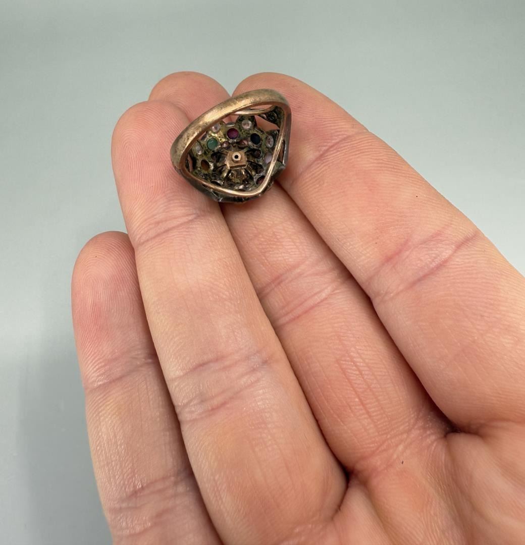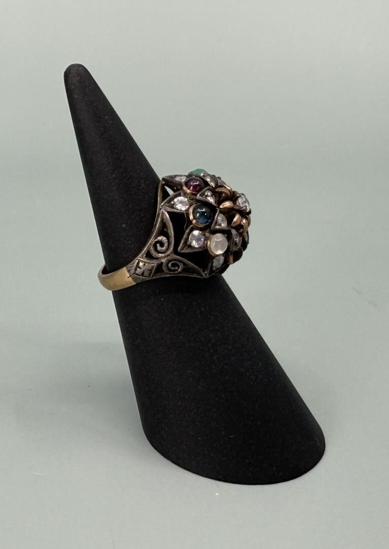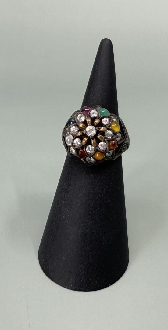 Size 5. 10k Yellow Gold with Sterling Overlay. Set with Sapphires, Rubies, Jade and More.