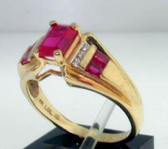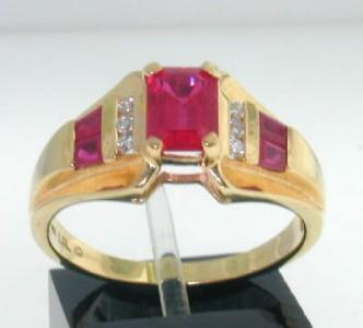 10k Yellow Gold with Ruby and Diamond ring! The total ring weight is 4.2g. The total diamond weight is 0.12cts ,approxmiately. I color, SI clarity. Measurement of center Lab ruby : 7x6mm, aside of lab ruby weight and size: 0.4cts, 3x2mm. The measure of the ring is 25x20 mm. The size of ring: 8.75. This is a beautiful ring.