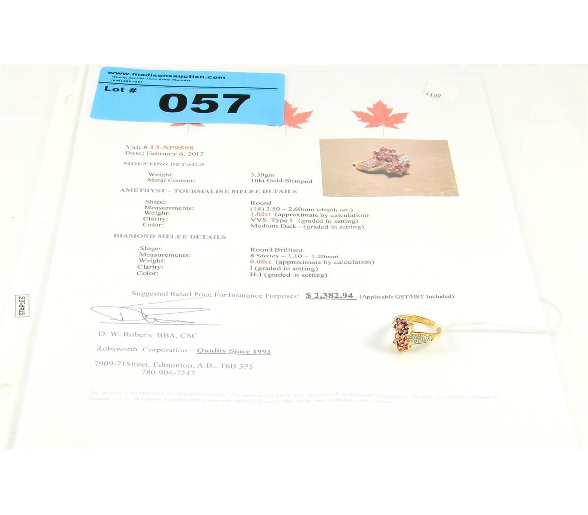 tourmaline- diamond ring. appraised value $2382