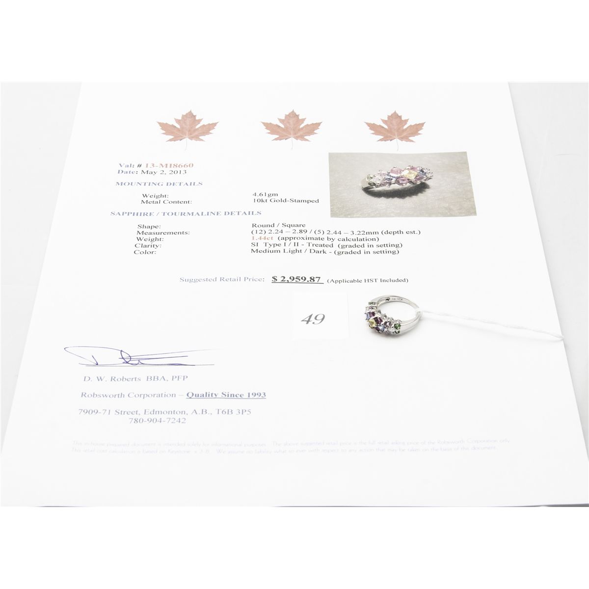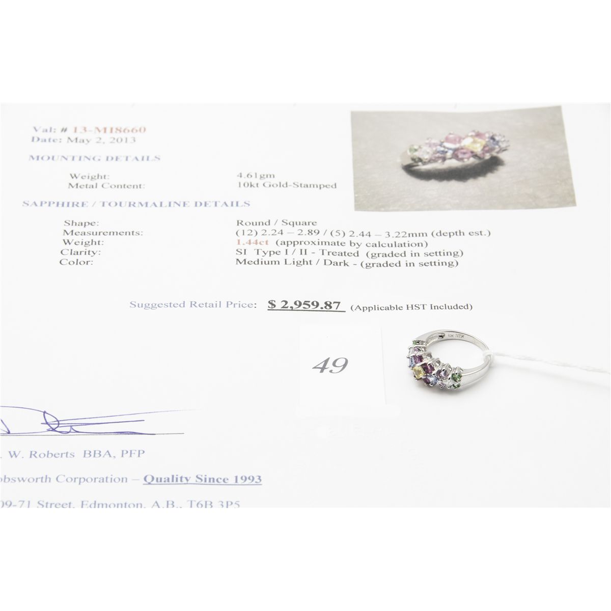 ring. appraised at $2959.87