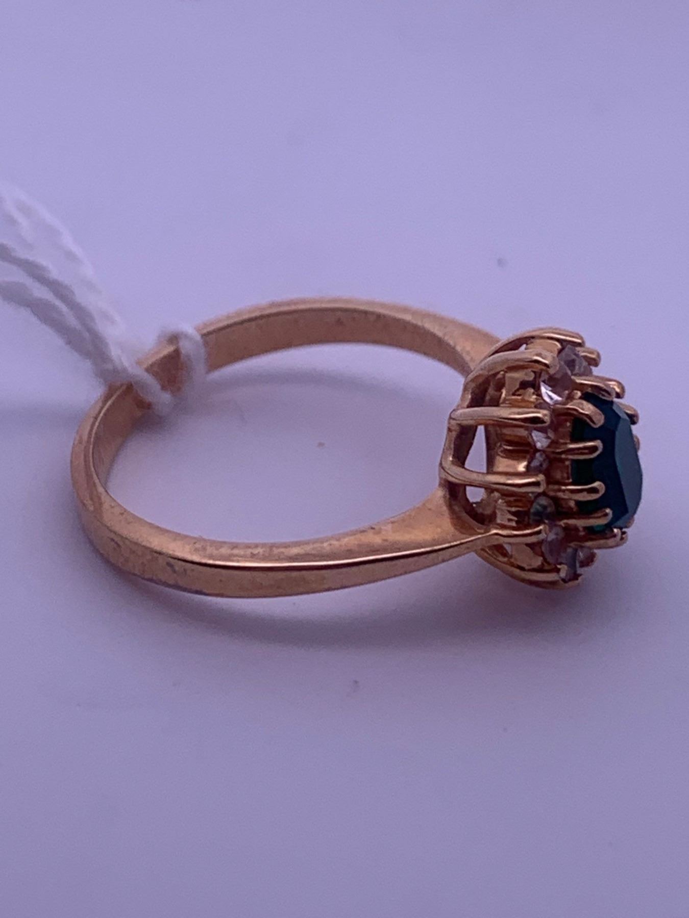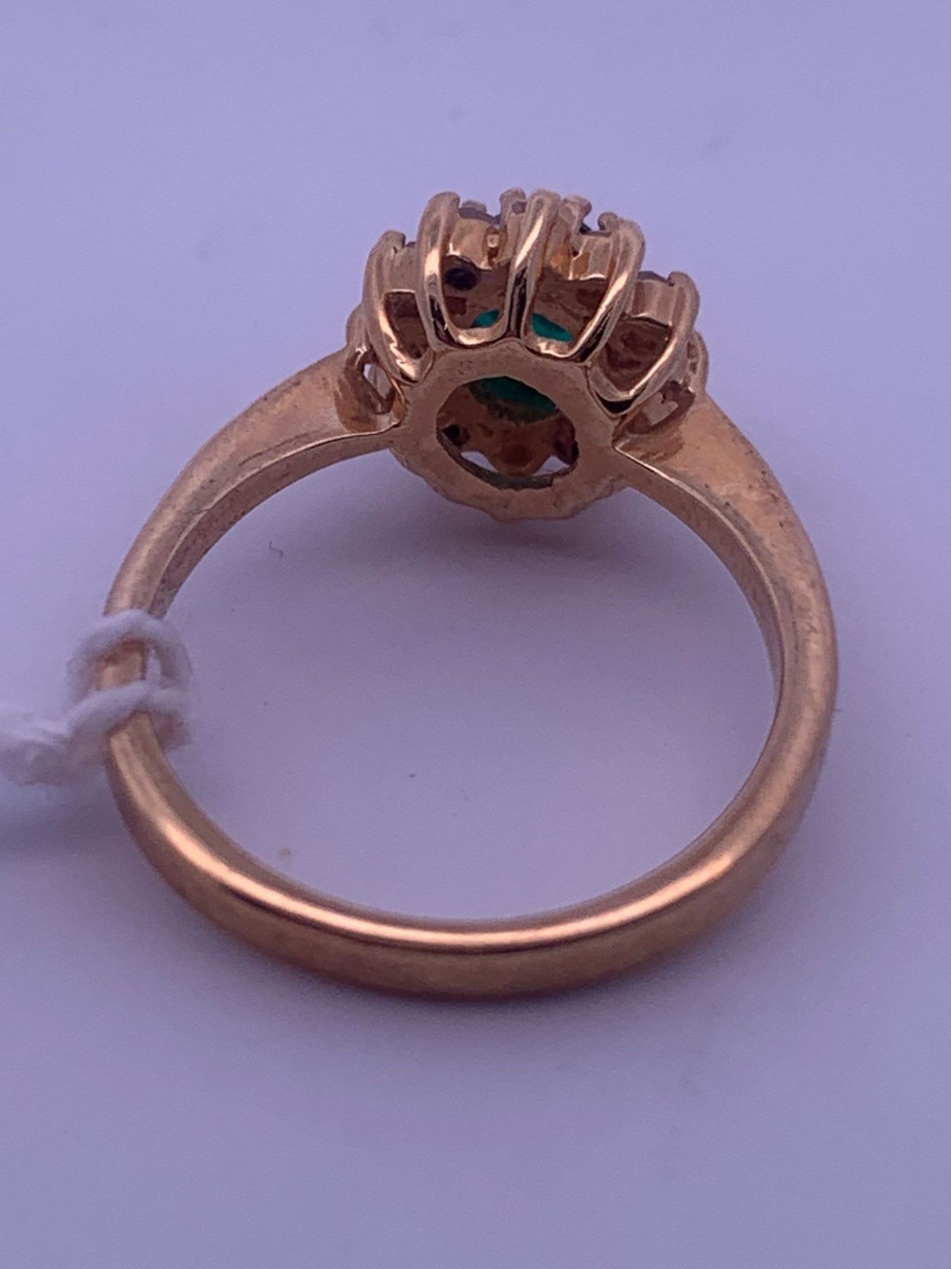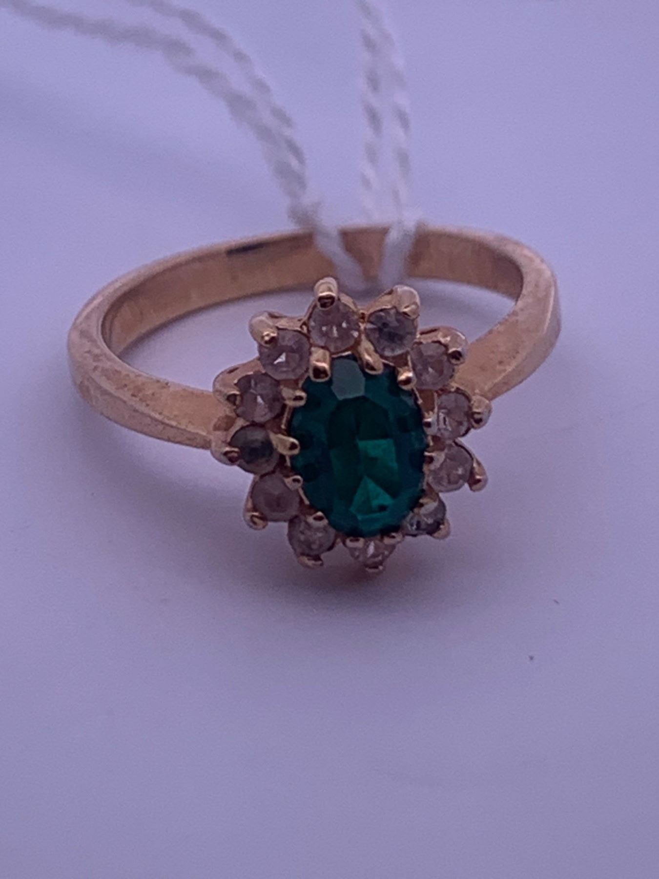 10k yellow gold ring with an emerald(?) centre stone, and melee diamonds; weighs 2.47 grams.