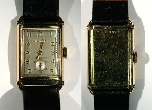 Rectangular face 10kt GF Bulova unisex wristwatch. Winder, water resistant black leather strap with white dial and gold numerals. Sub-dial and original crystal. Good working condition.