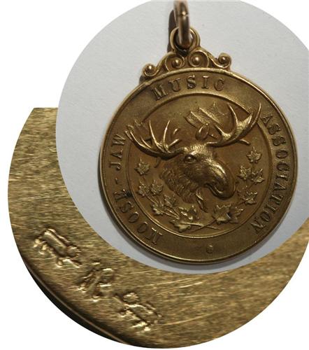 10kt yellow gold medal specially crafted for the Moose Jaw Music Association with bale to be worn on a chain. High relief reverse design of a Moose Head surrounded by a maple leaf wreath.