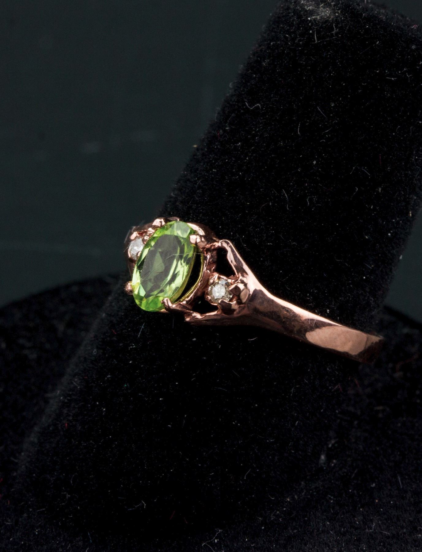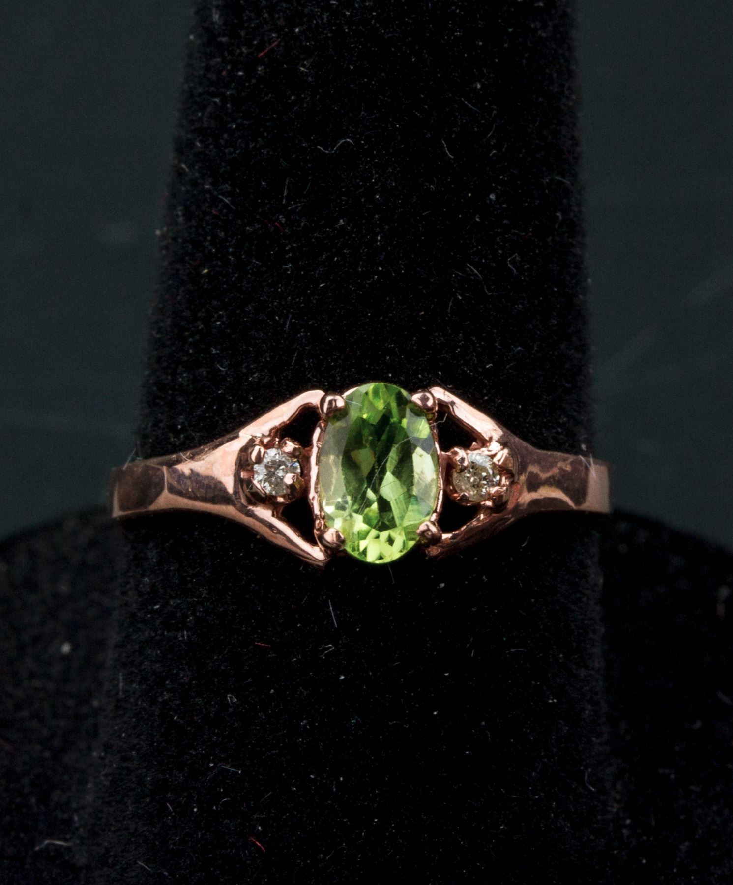 10kt yellow gold claw set peridot and diamond ring; set with oval shape natural peridot and two round brilliant cut diamonds; certified replacement value: 550; 1.31 grams