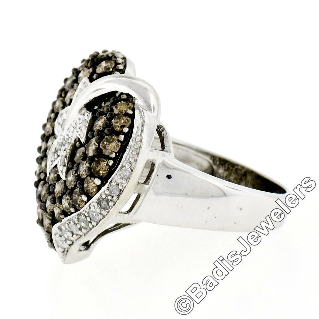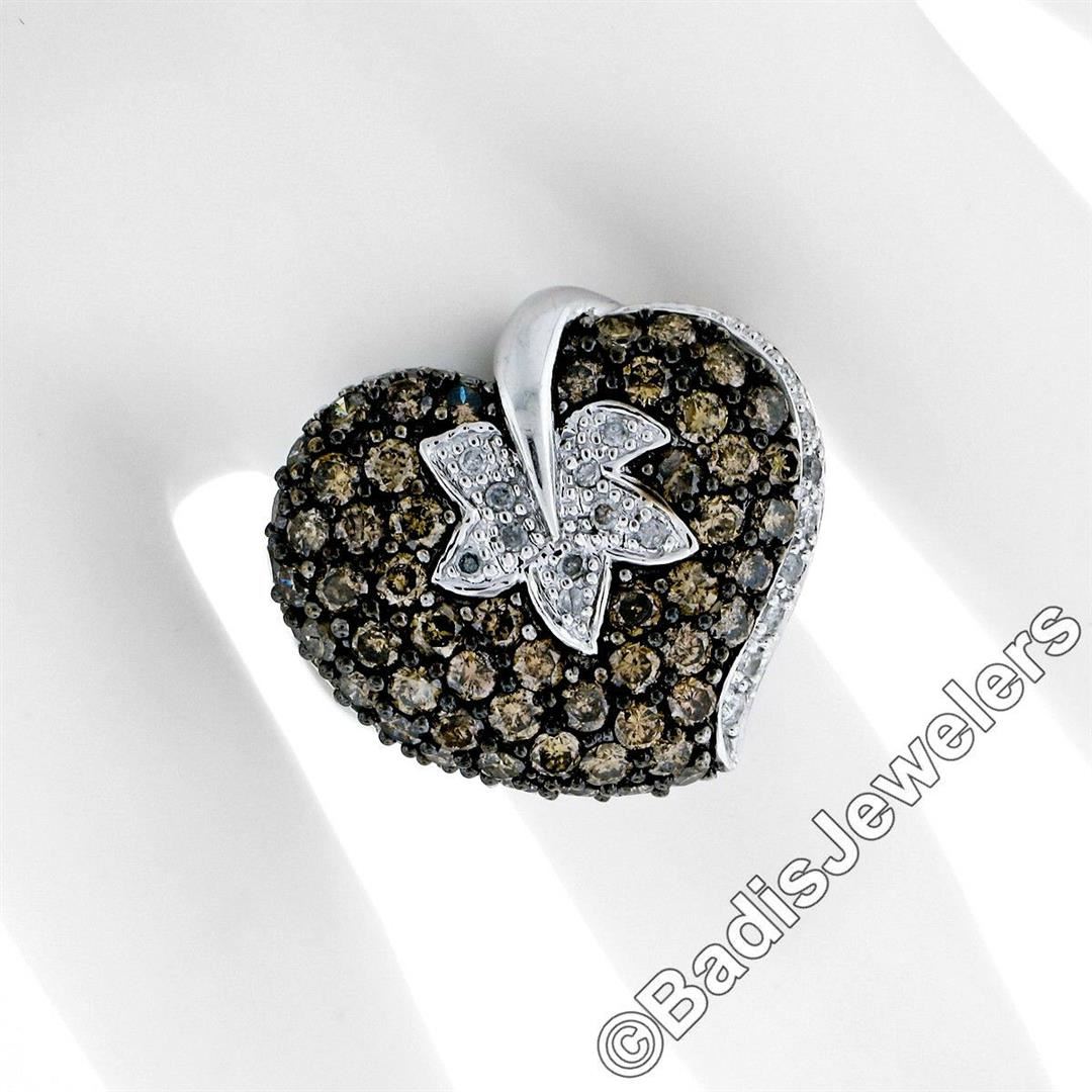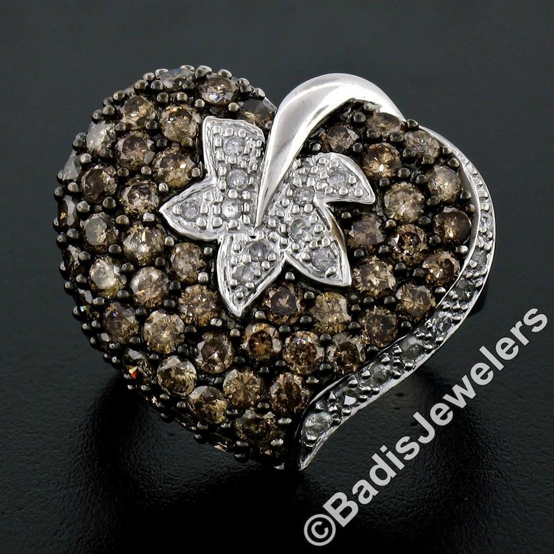 A 10kt white gold leaf and heart motif ring with 2.85ctw of prong set round brilliant fancy light brown diamonds (SI2/I1) accented by an additional 0.25ctw of pave set round brilliant white diamonds (H - I1/I2). The ring is size 7.0, weighs a total of 8.28 grams, and measures 21.0mm wide.
