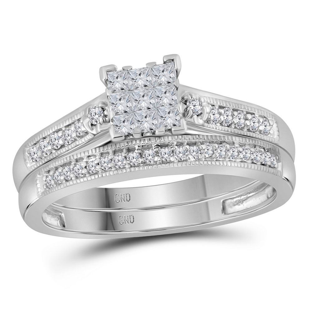 10kt White Gold His & Hers Princess Diamond Cluster Matching Bridal Wedding Ring Band Set 1/2 Cttw