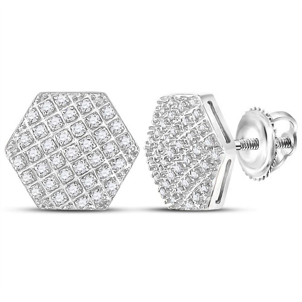10kt White Gold Mens Round Diamond Hexagon Cluster Stud Earrings 1/5 Cttw