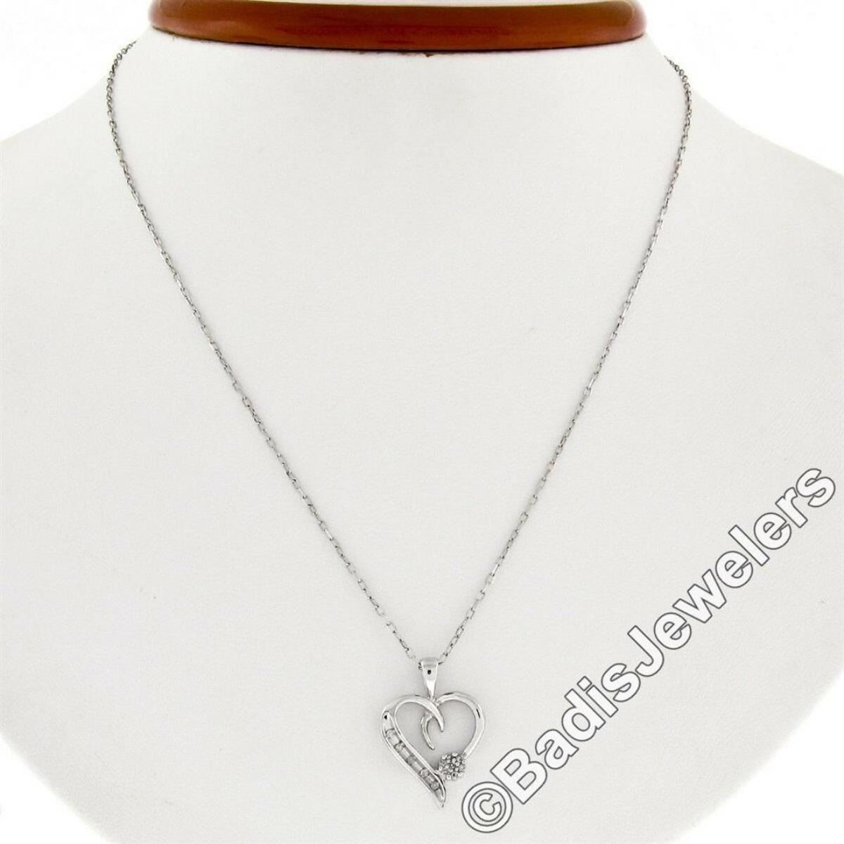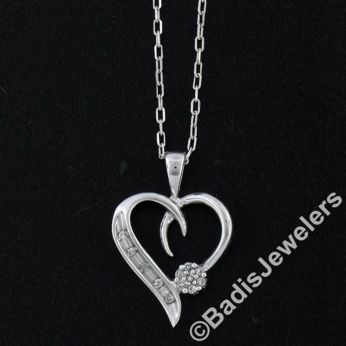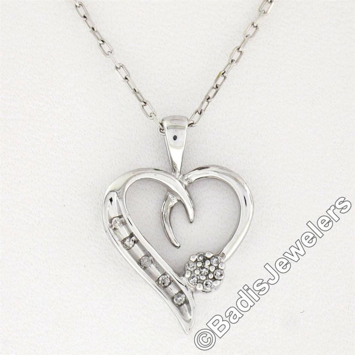 A 10kt white gold open heart pendant necklace featuring 12 pave set round single cut diamonds (H/I - SI2/I1; 0.06ctw). 16 inch 14kt white gold cable link chain, 2.07 grams total weight, pendant measures 20.5x14.0mm.