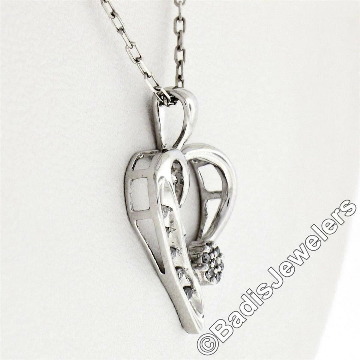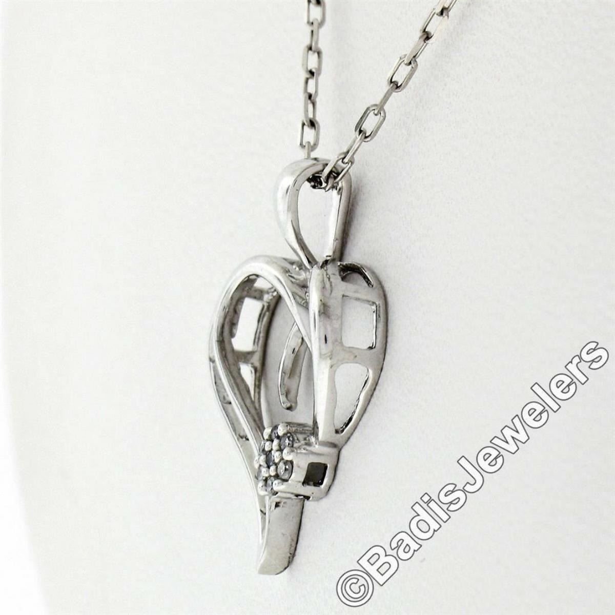 A 10kt white gold open heart pendant necklace featuring 12 pave set round single cut diamonds (H/I - SI2/I1; 0.06ctw). 16 inch 14kt white gold cable link chain, 2.07 grams total weight, pendant measures 20.5x14.0mm.