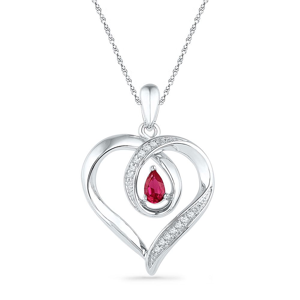 10kt White Gold Womens Pear Lab-Created Ruby Diamond Heart Pendant 1/20 Cttw