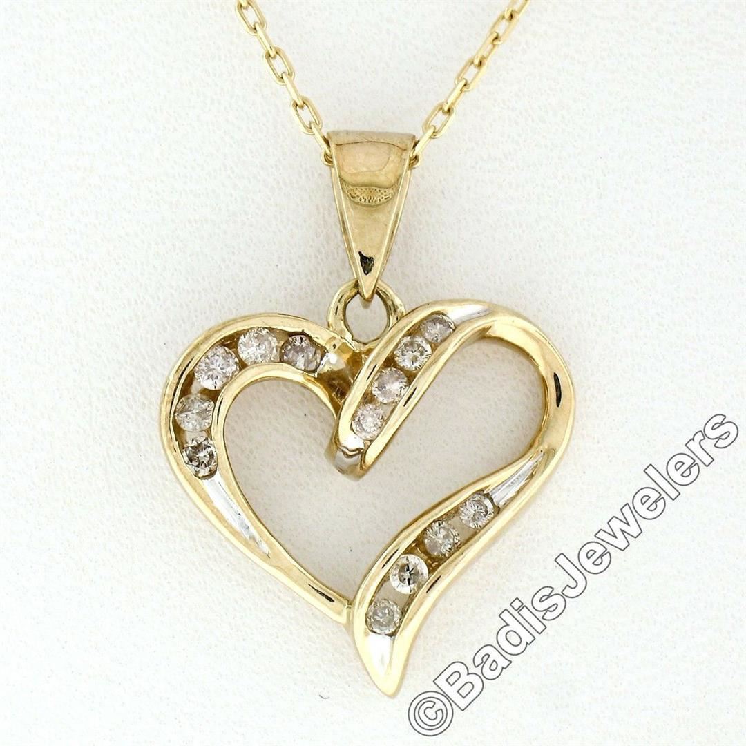 A 10kt yellow gold open heart pendant necklace featuring 13 channel set round brilliant diamonds (I - I1/I2; 0.26ctw). 16 inch 14kt yellow gold cable link chain, 3.75 grams total weight, pendant measures 17.8x17.8mm.