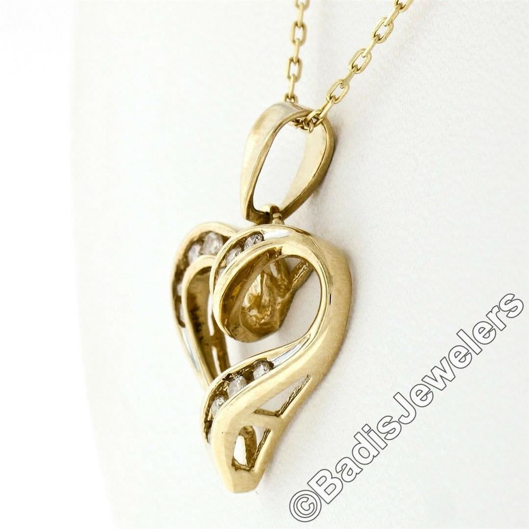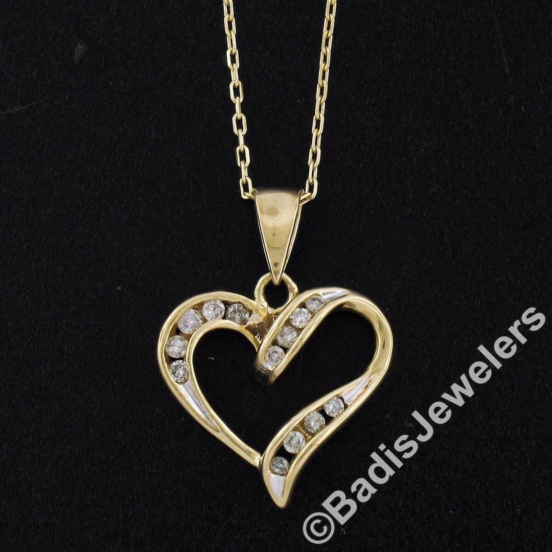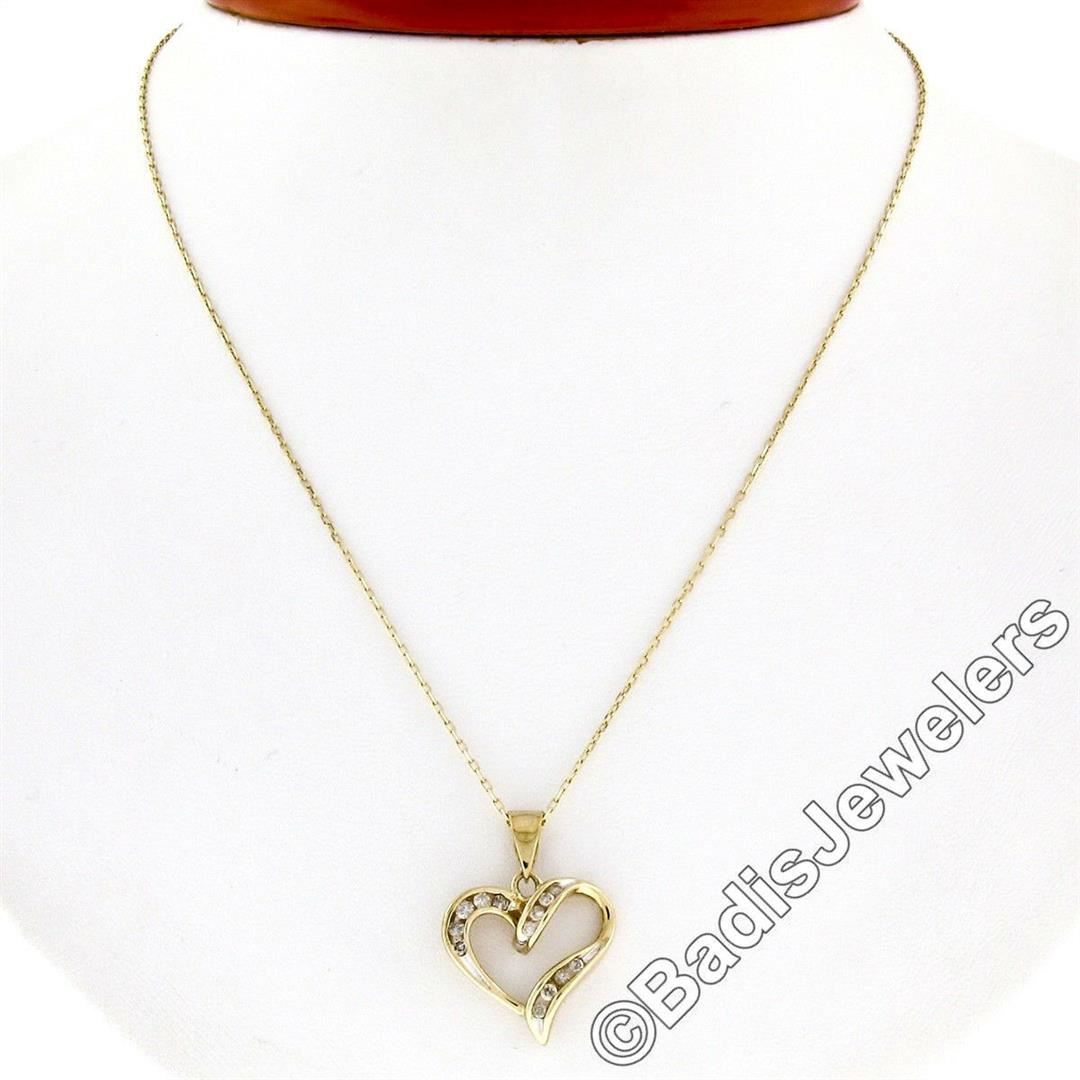 A 10kt yellow gold open heart pendant necklace featuring 13 channel set round brilliant diamonds (I - I1/I2; 0.26ctw). 16 inch 14kt yellow gold cable link chain, 3.75 grams total weight, pendant measures 17.8x17.8mm.