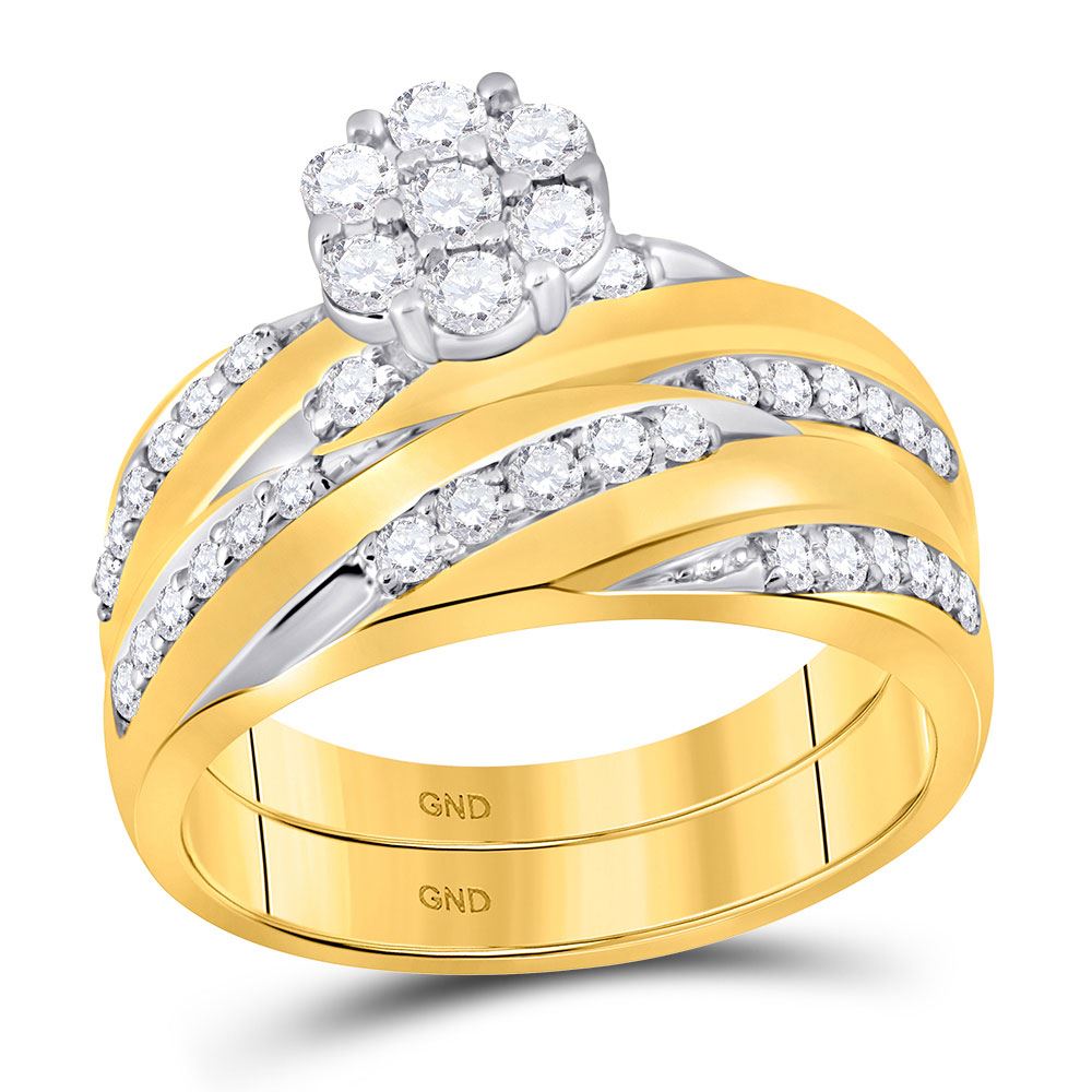 10kt Yellow Gold His & Hers Round Diamond Cluster Matching Bridal Wedding Ring Band Set 1.00 Cttw