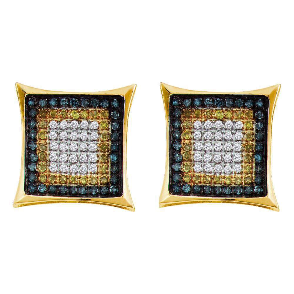 10kt Yellow Gold Mens Yellow Blue Color Enhanced Diamond Square Cluster Earrings 1/3 Cttw