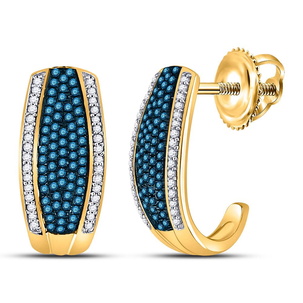10kt Yellow Gold Womens Round Blue Color Enhanced Diamond Half J Hoop Earrings 1/2 Cttw