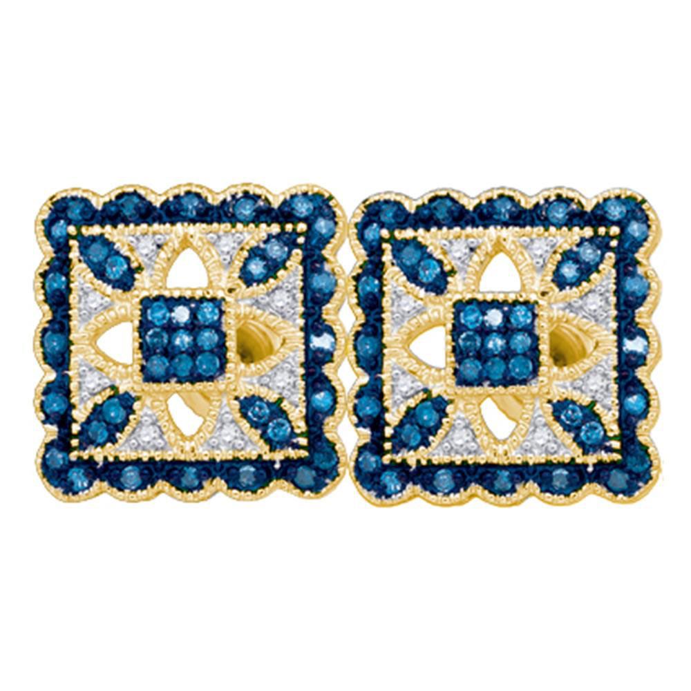 SKU: RB81587 ---- 10kt Yellow Gold Round Blue Color Enhanced Diamond Square Cluster Earrings 1/4 Cttw