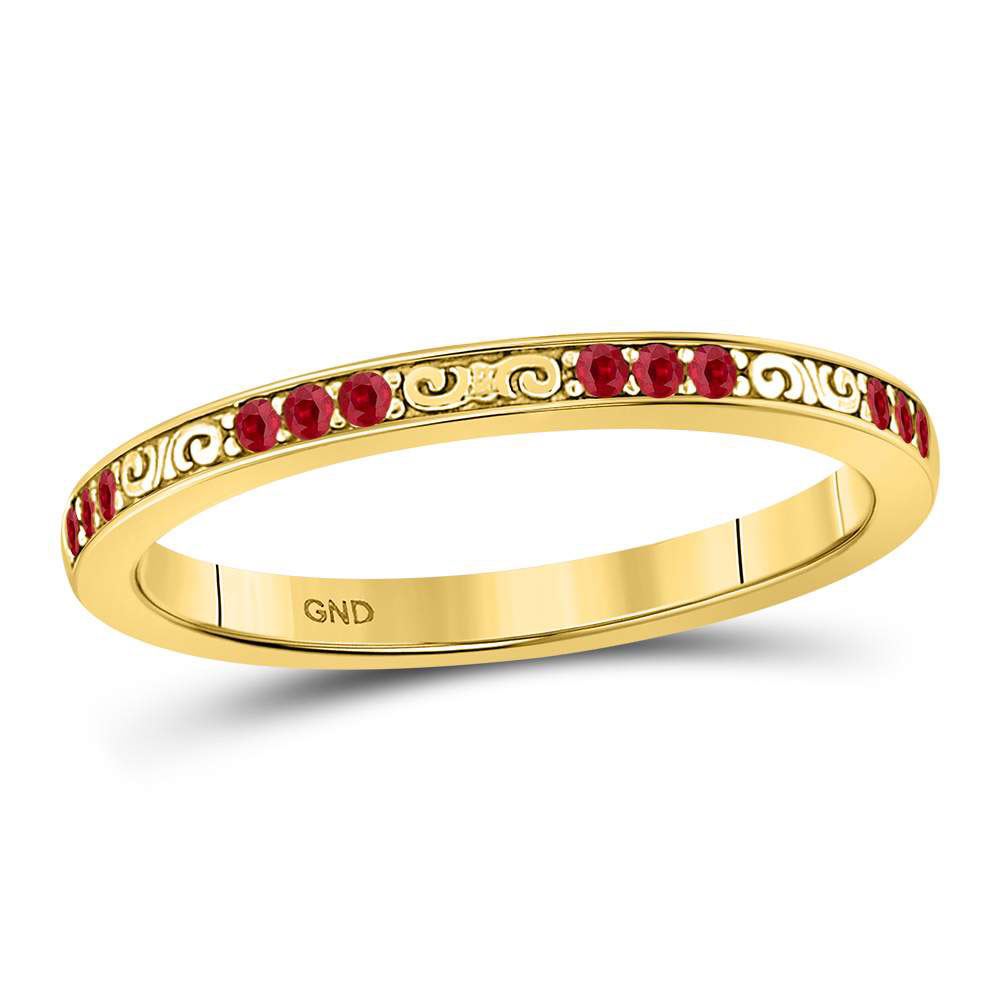10kt Yellow Gold Womens Round Ruby Single Row Flourished Stackable Band Ring 1/8 Cttw