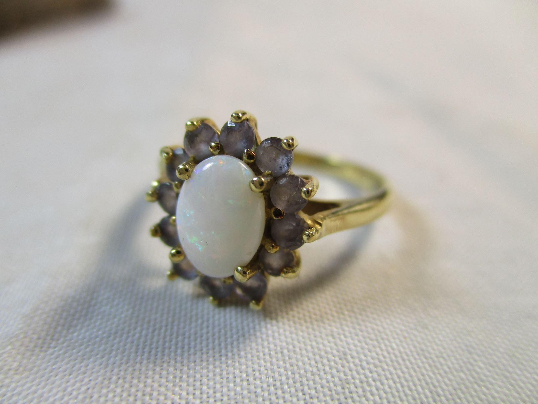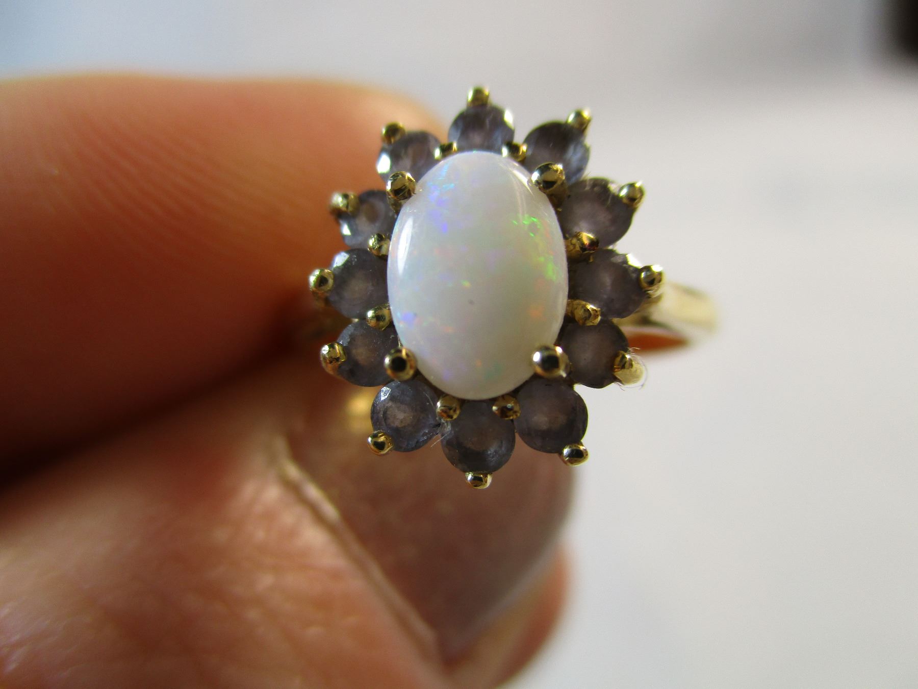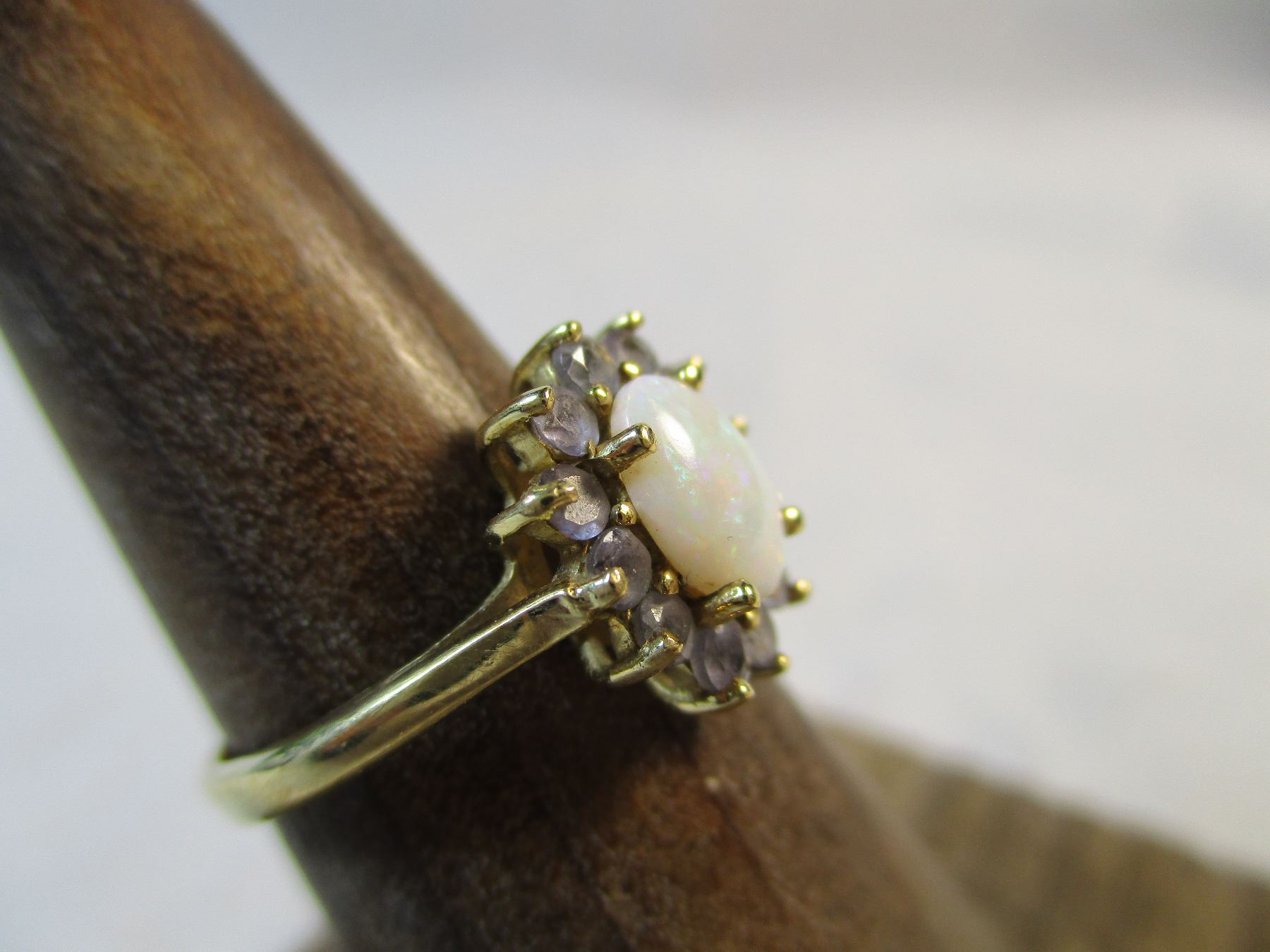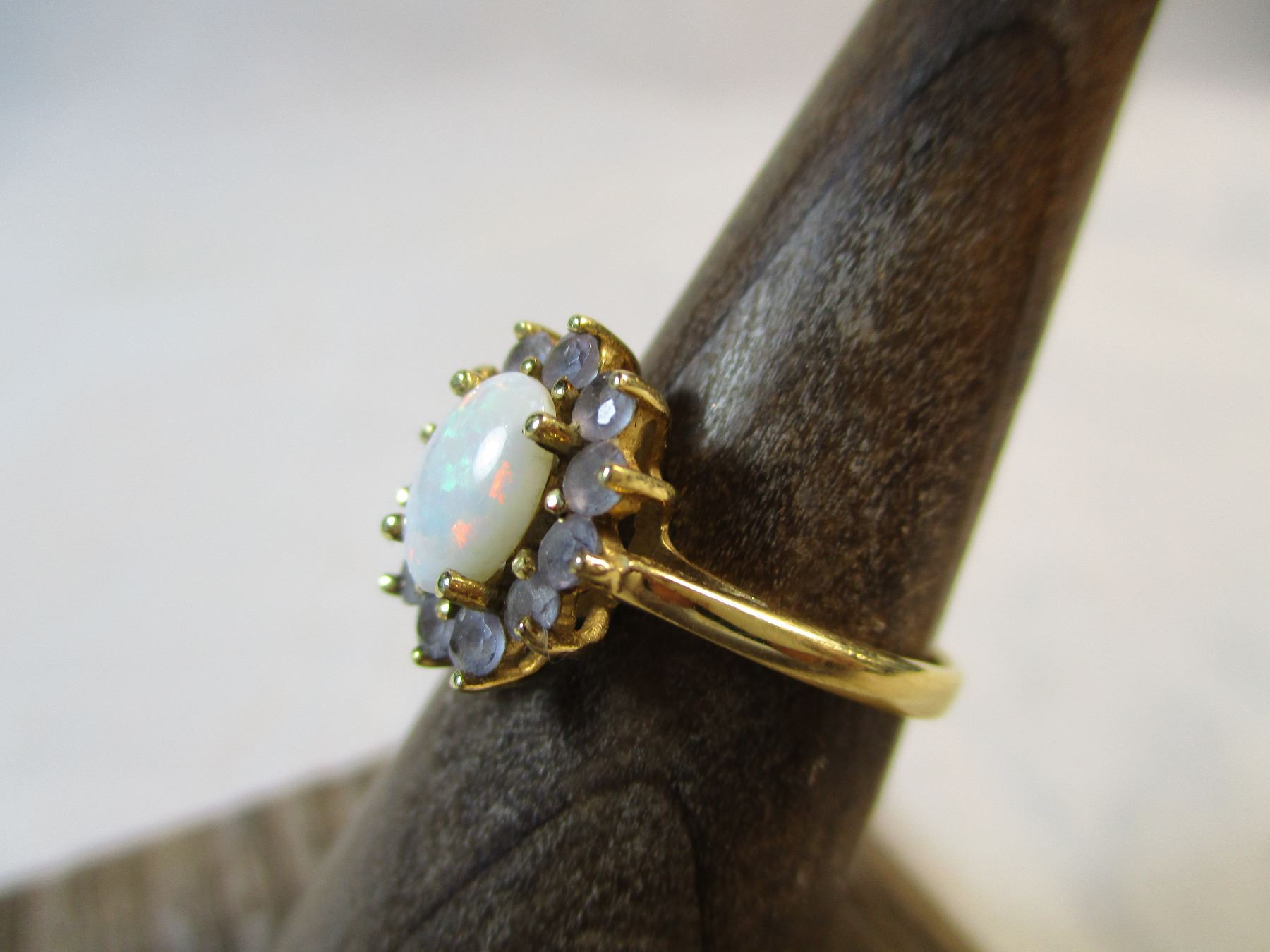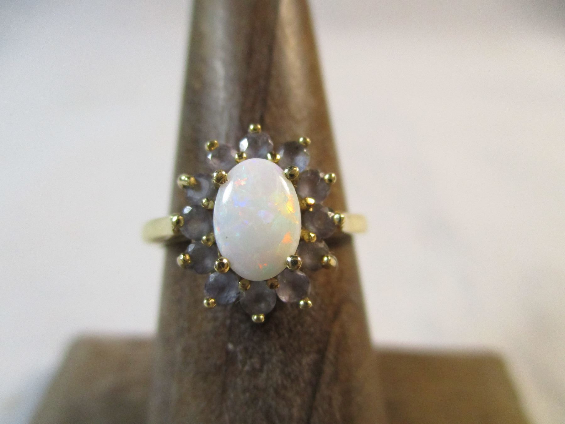 Beautiful 10kt gold Opal and Tanzanite Ring size 5 from Riddles Jewelry in nice wood display box.