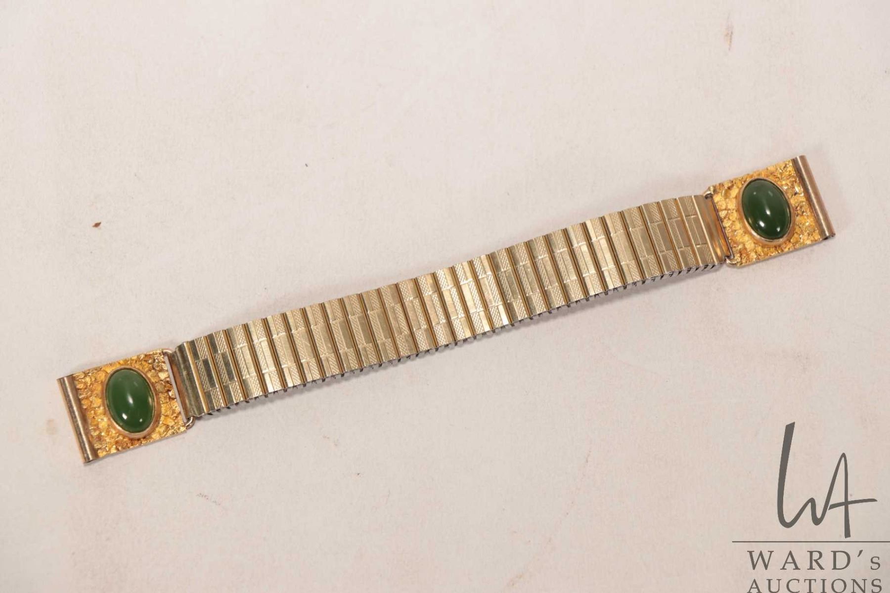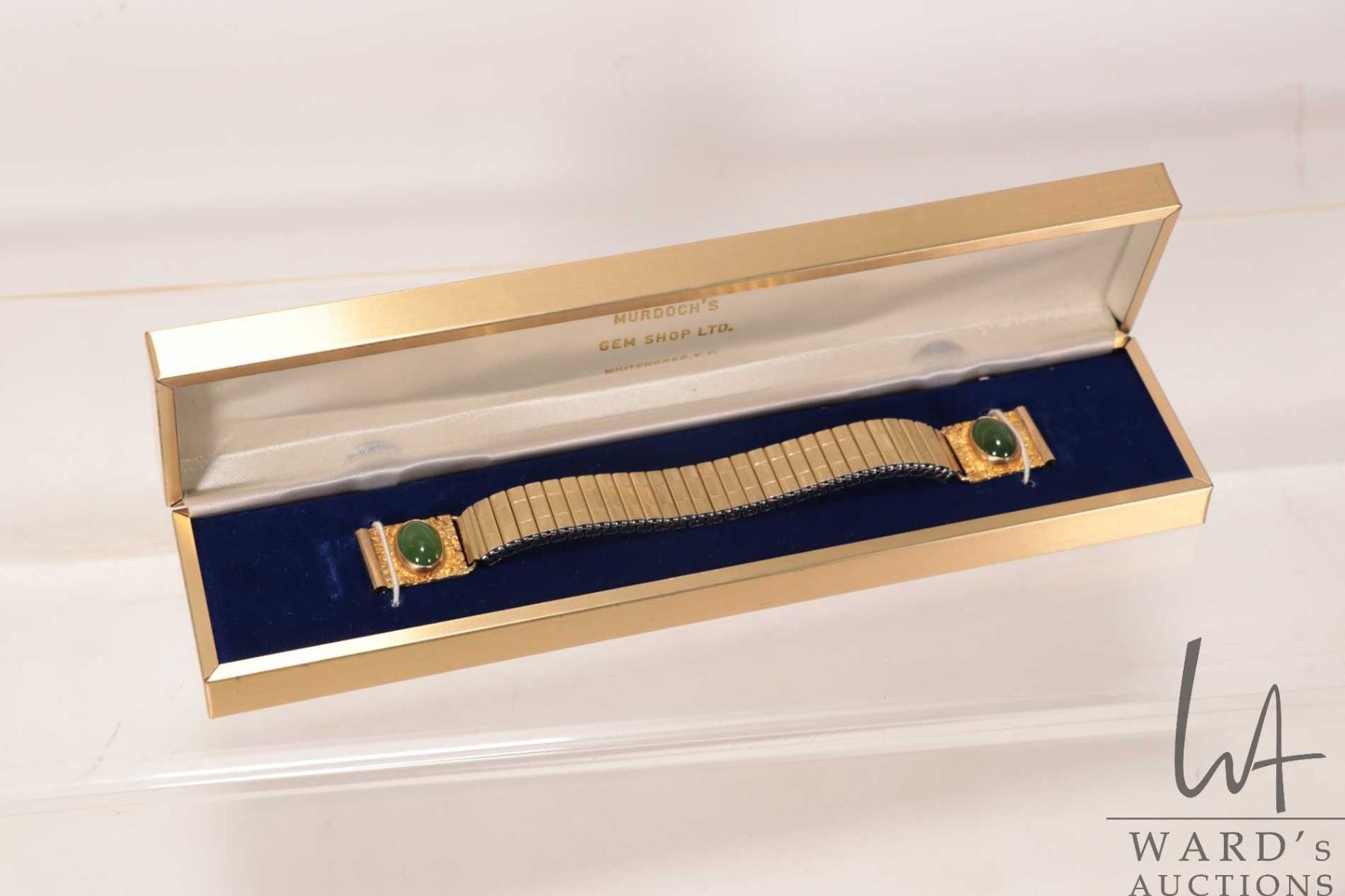 10kt yellow gold end links set with cabochon oval jade gemstones, each end engraved and marked "Yukon" 10kt, attached to a gold tone stainless watch strap. Includes Murdoch's Gem Shop Ltd. Whitehorse Y.T. box