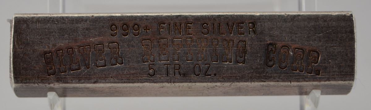 This rectangle shaped 5oz Rectangle Shaped silver bar comes from the famous but no longer in business refining corp.
