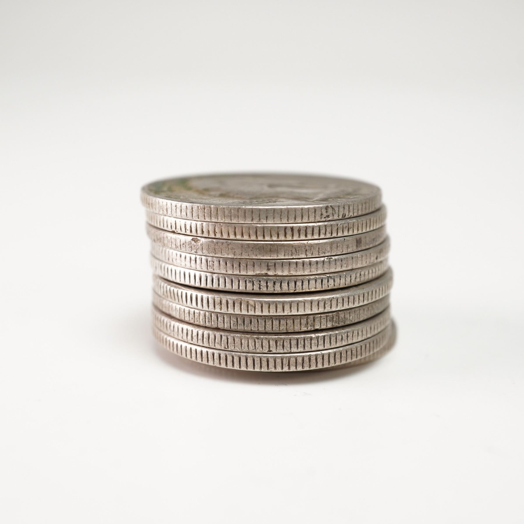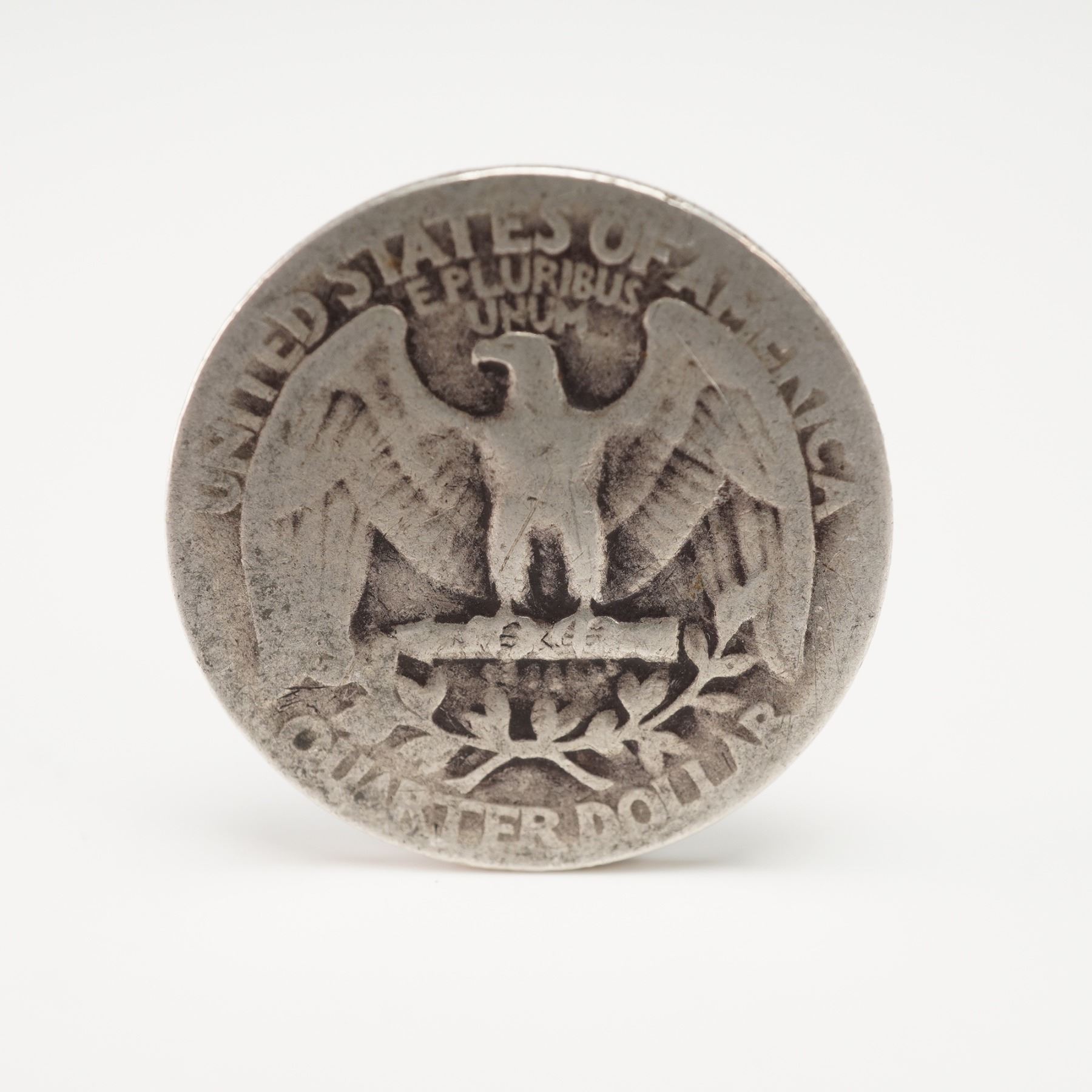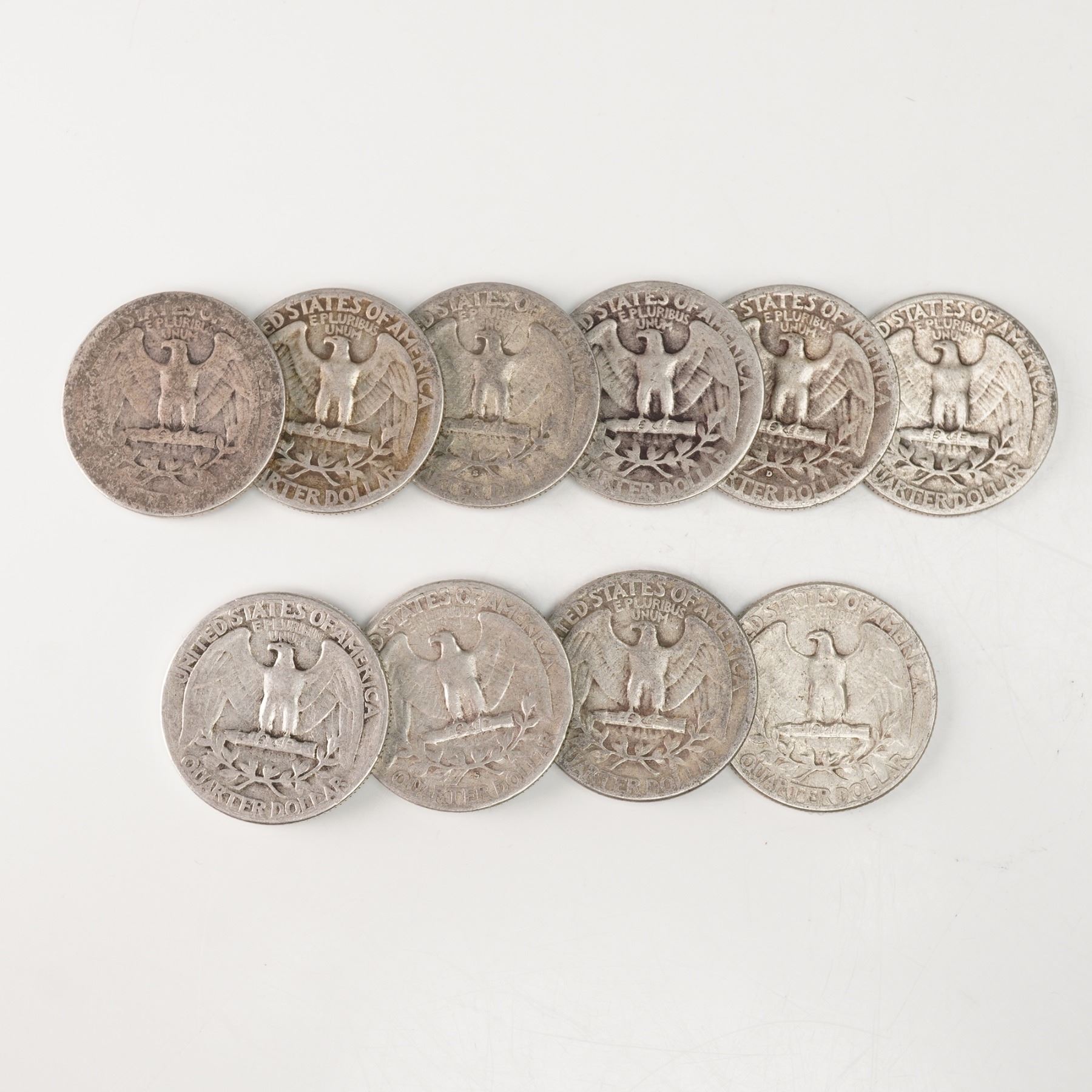 Each coin features the left-facing portrait of George Washington on the obverse, with the inscriptions LIBERTY, IN GOD WE TRUST, and the year of issue. The reverse displays a heraldic eagle with outstretched wings perched on a bundle of arrows above olive branches, accompanied by the inscriptions UNITED STATES OF AMERICA, E PLURIBUS UNUM, and QUARTER DOLLAR. These coins were struck at various U.S. Metal content: each coin contains 0.1808 troy ounces of 90% silver and 10% copper.