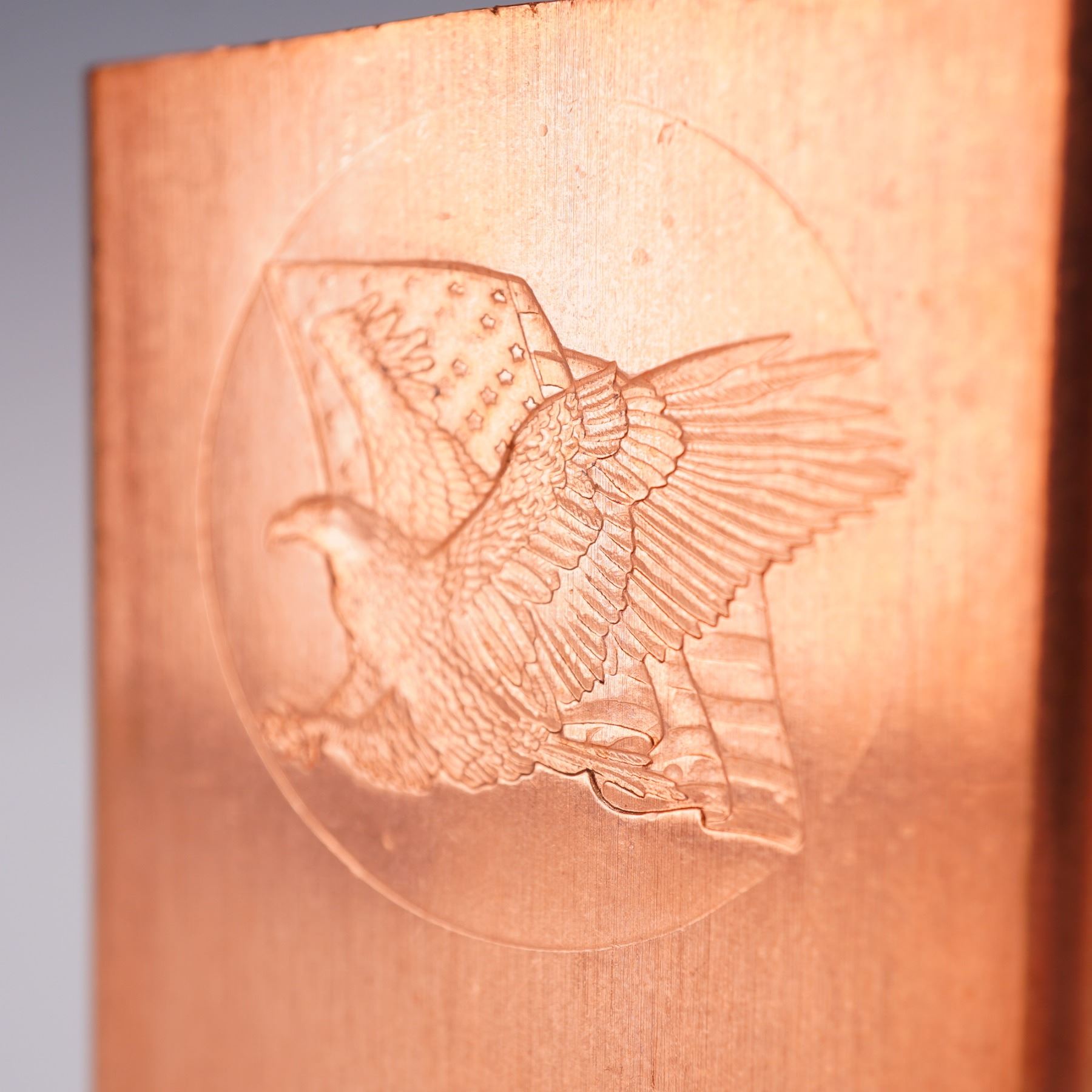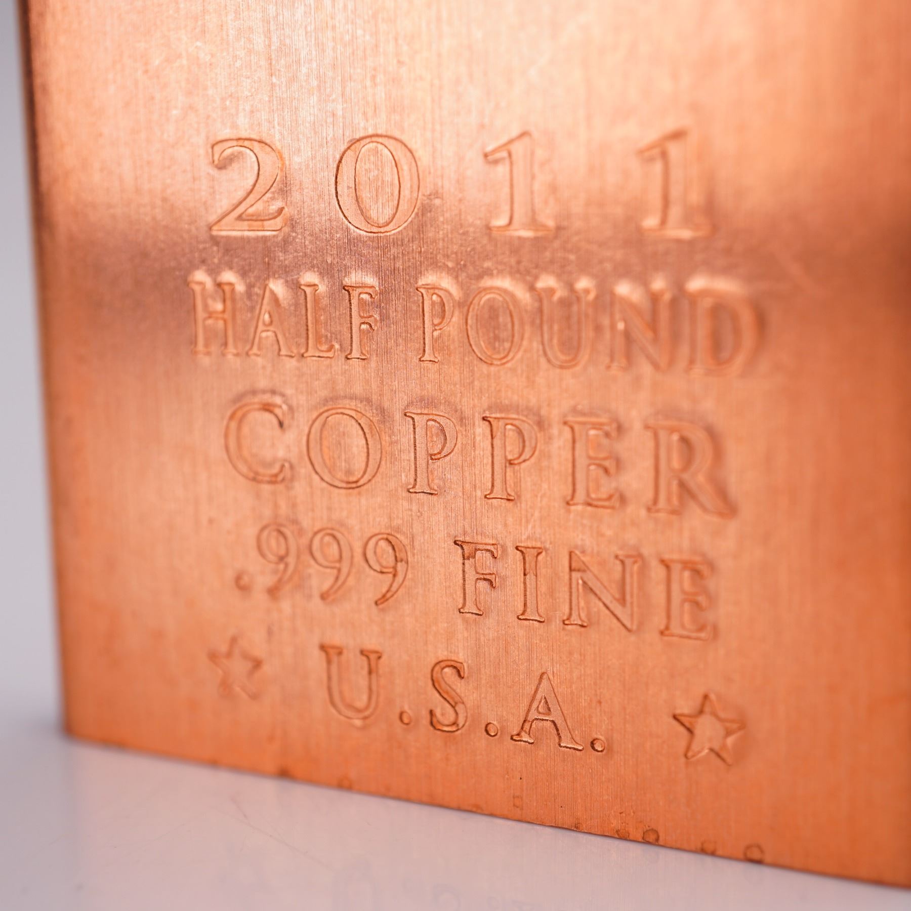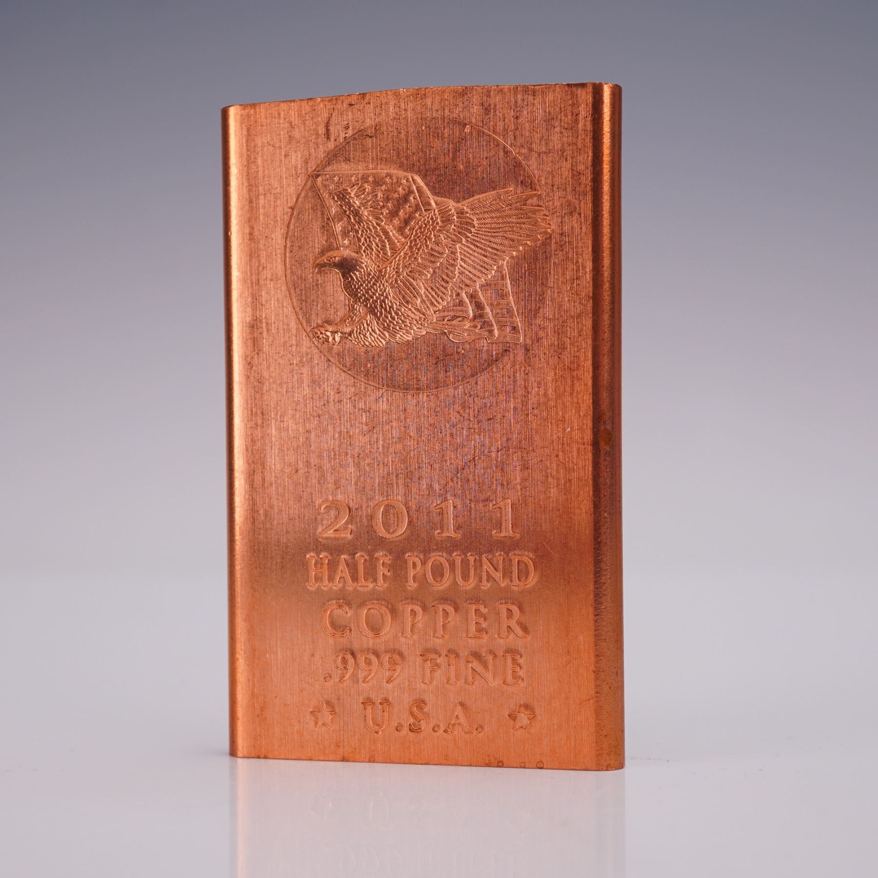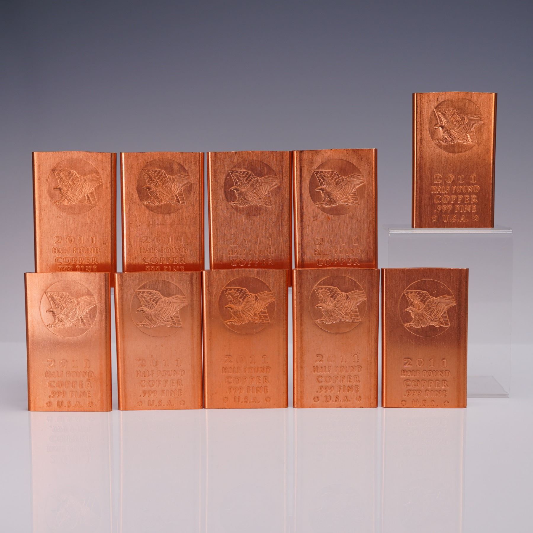 Ten copper bars, each dated 2011 and struck in the United States of America. Every bar is composed of .999 fine copper and weighs half a pound. The bars are uniform in design and composition, and each one is marked with the following text engraved in capital block letters: 2011 HALF POUND COPPER .999 FINE U.S.A. An image of an American bald eagle with wings spread, set in front of a waving American flag inside a circular border, is prominently engraved above the text on the front of each bar. The bars feature a brushed finish, and the engravings are recessed into the copper surface. A copper bar measures: 3.25"L x 2"W x 0.25"H.