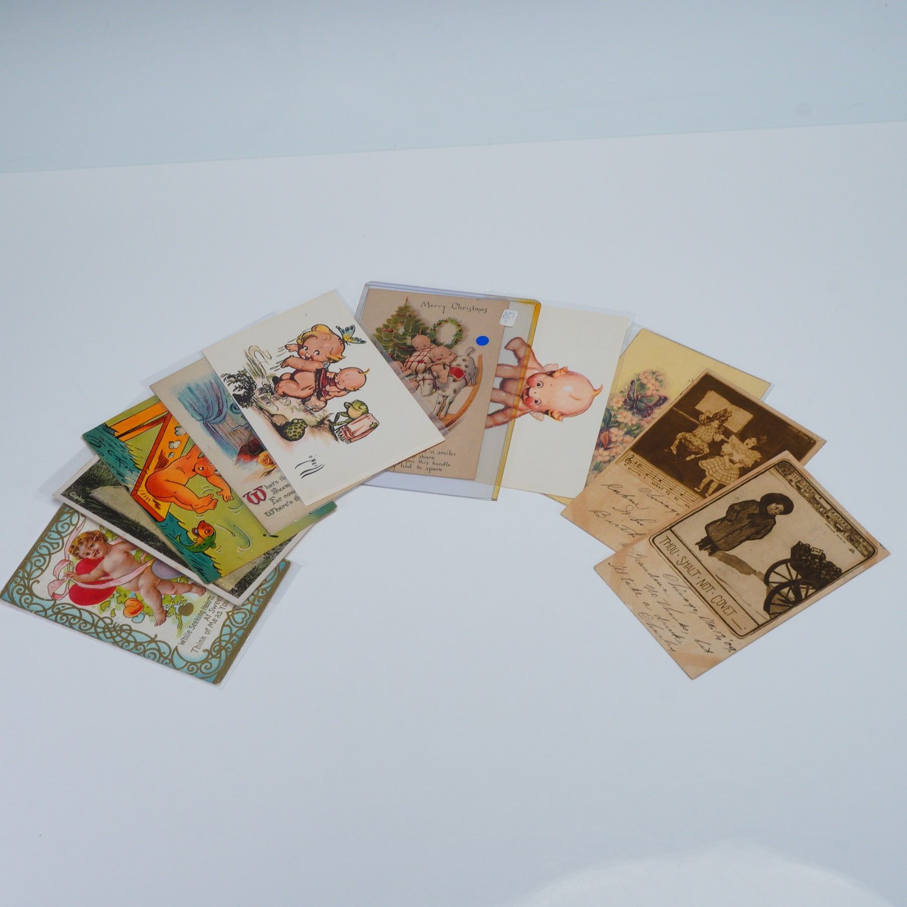 A collection of illustrated postcards featuring whimsical and sentimental imagery including cherubs, children, and holiday greetings. Showcases a variety of artistic techniques with several cards bearing handwritten correspondence and early postal markings. Some are housed in plastic sleeves for preservation.